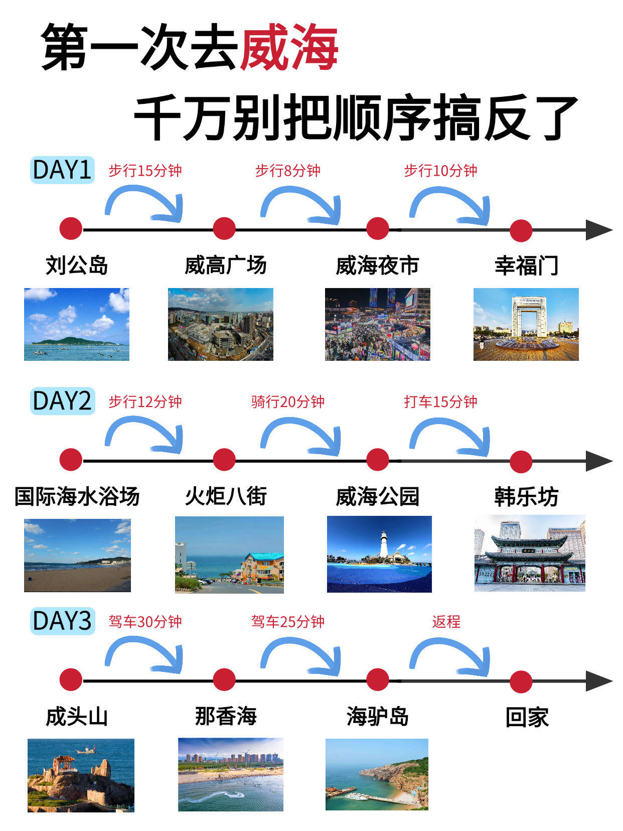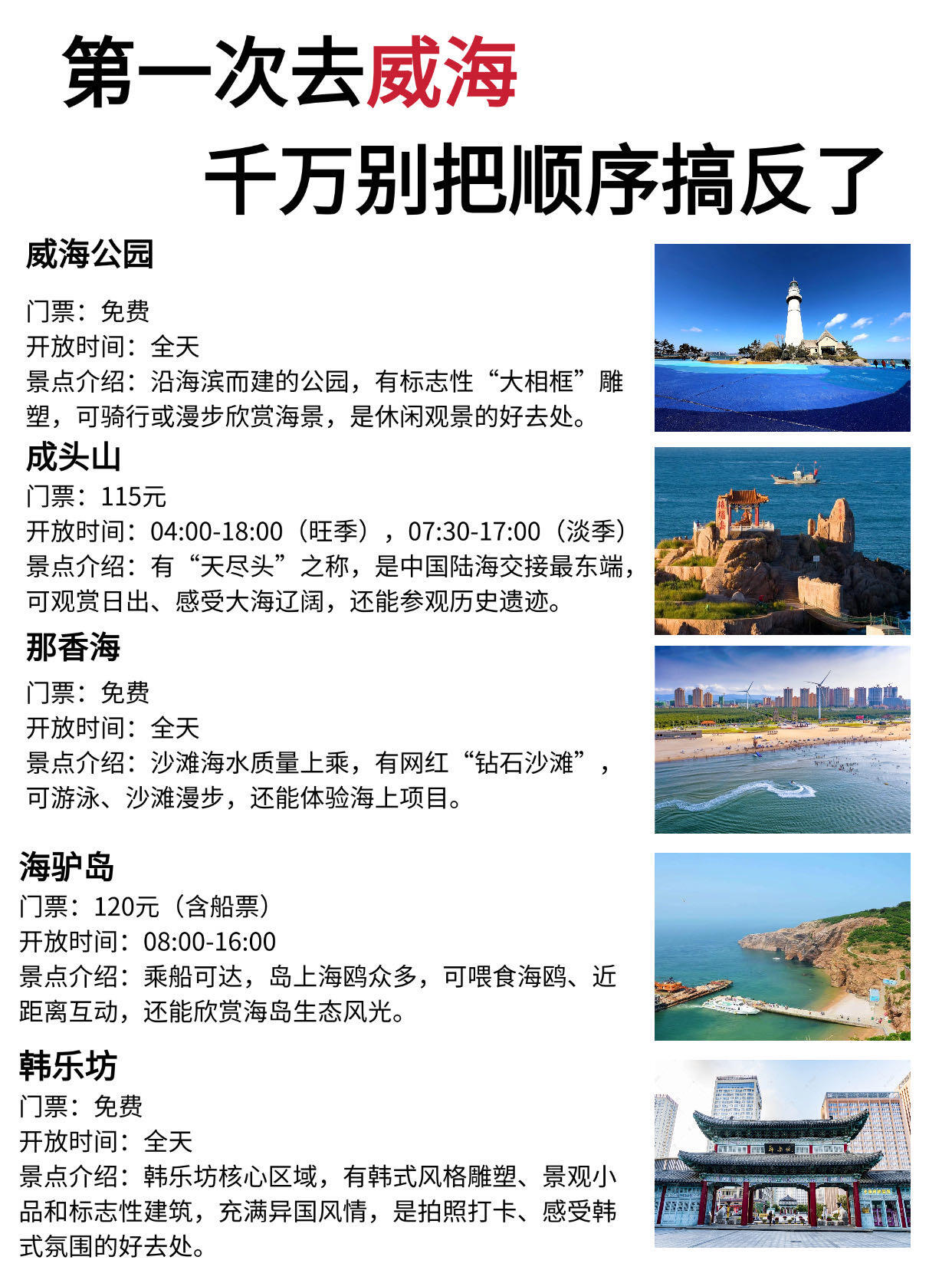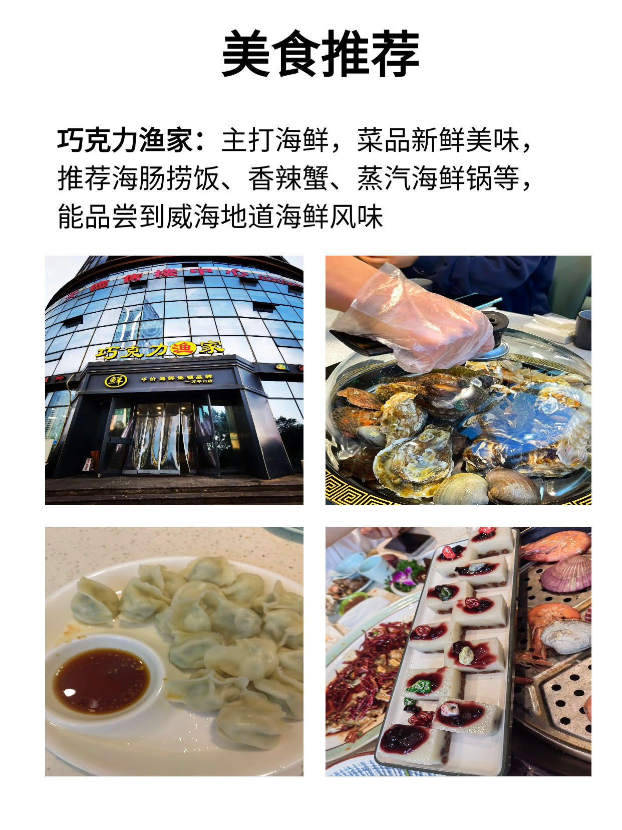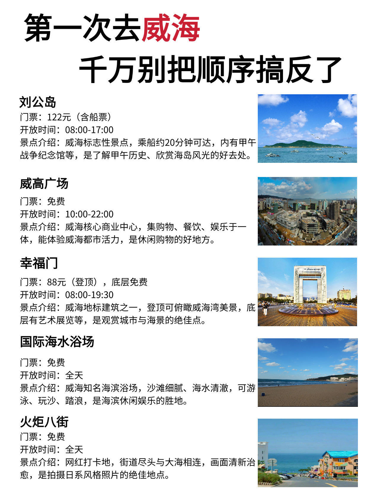 先去刘公岛(门票122元,08:00开),沉浸式了解甲午历史;下午逛威高广场(免费)感受都市活力,傍晚登幸福门(登顶88元)俯瞰威海湾全景,绝美!