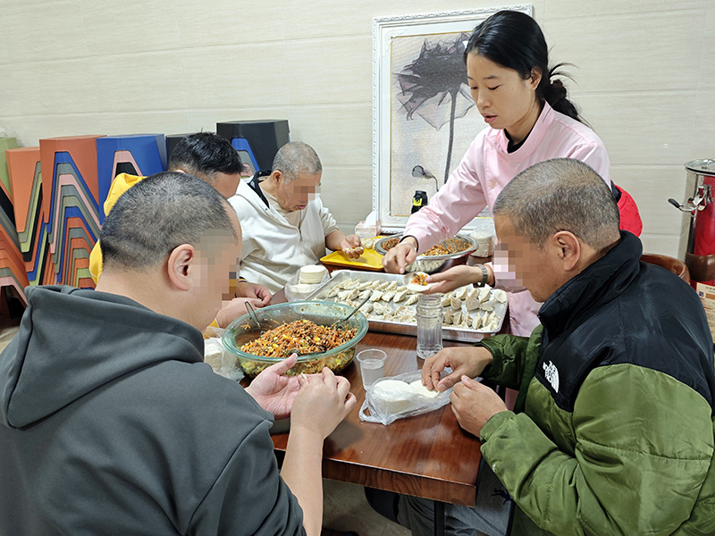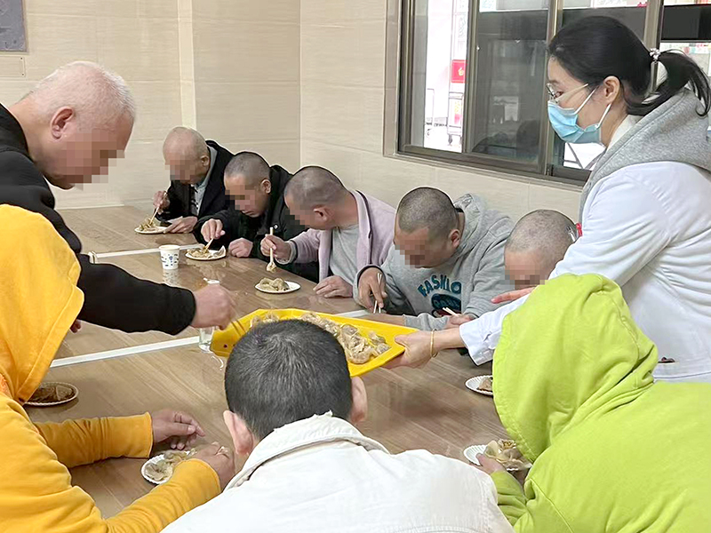 当一盘盘热气腾腾的饺子端上桌时,整个康复大厅弥漫着饺子的香味。他们迫不及待地品尝着自己亲手包的饺子,脸上洋溢着幸福的笑容。一位来自五区的患者笑着说:“饺子好吃,蘸料也很香,吃得饱饱的很开心。”期间也有患者邀请治疗师与他们一起品尝,大家围坐在一起,传递温暖分享幸福。