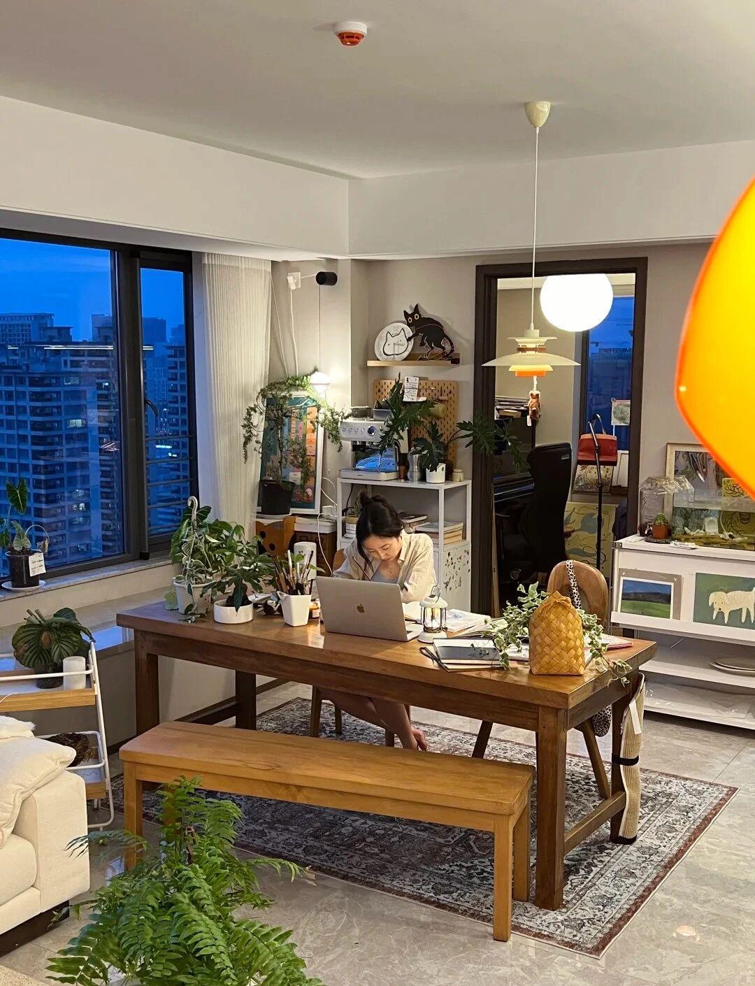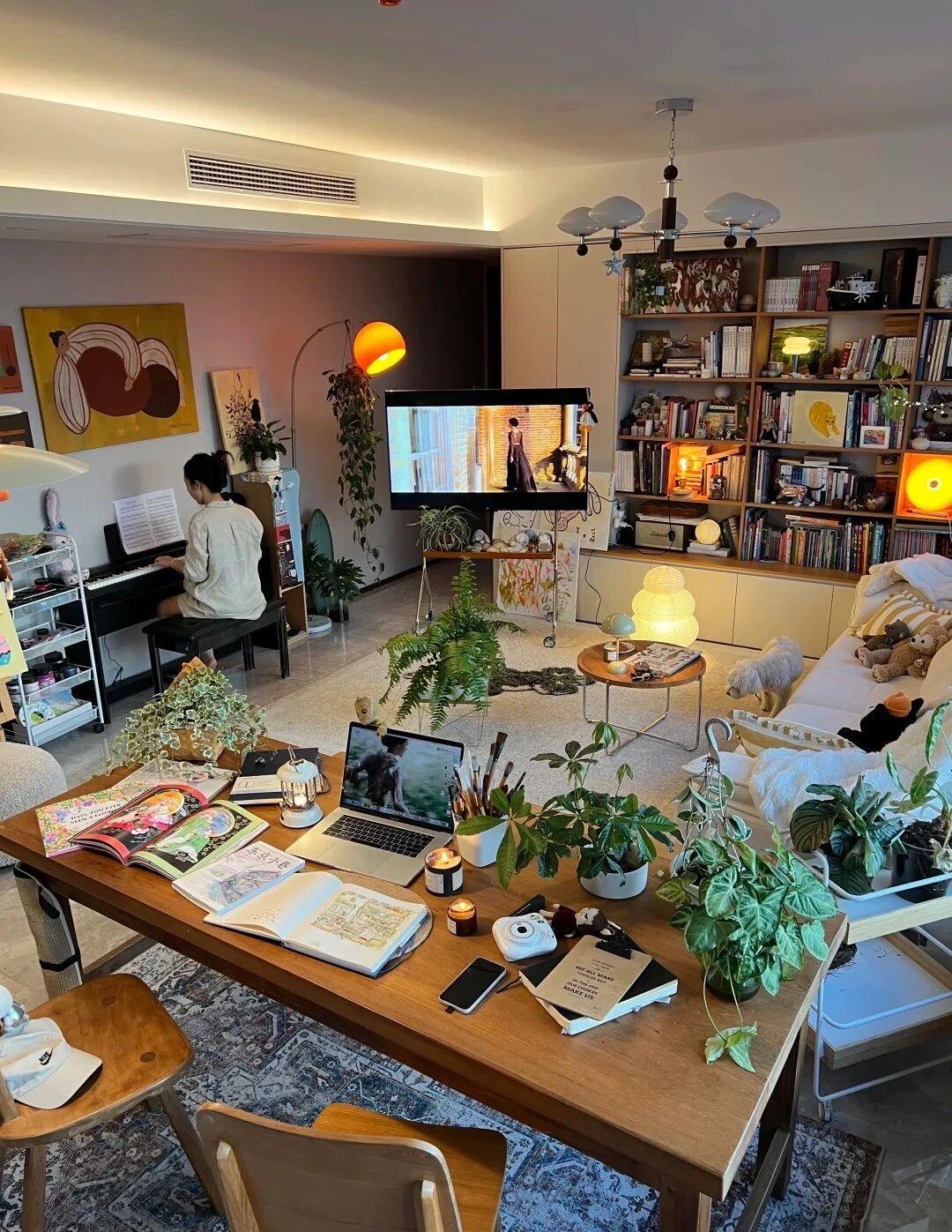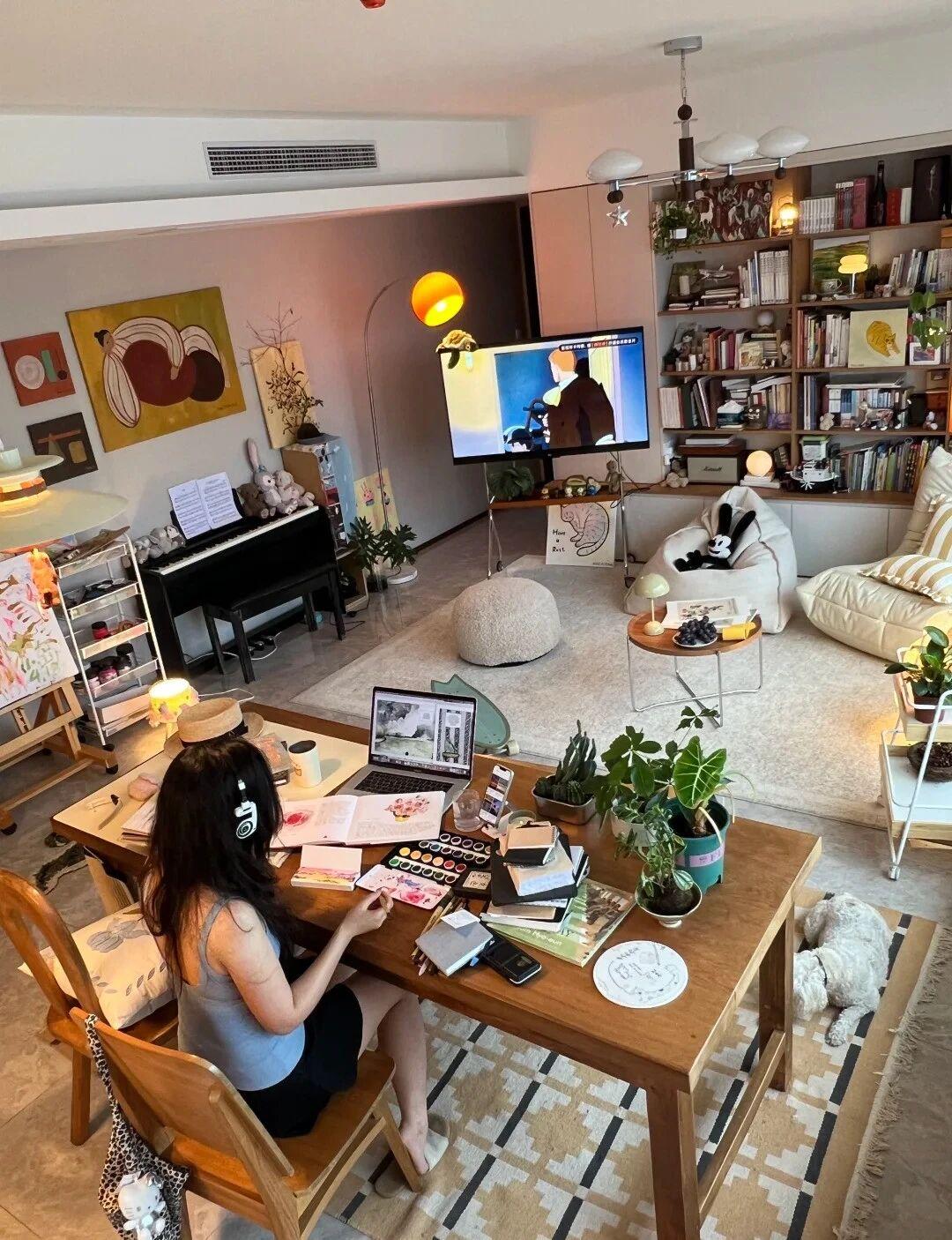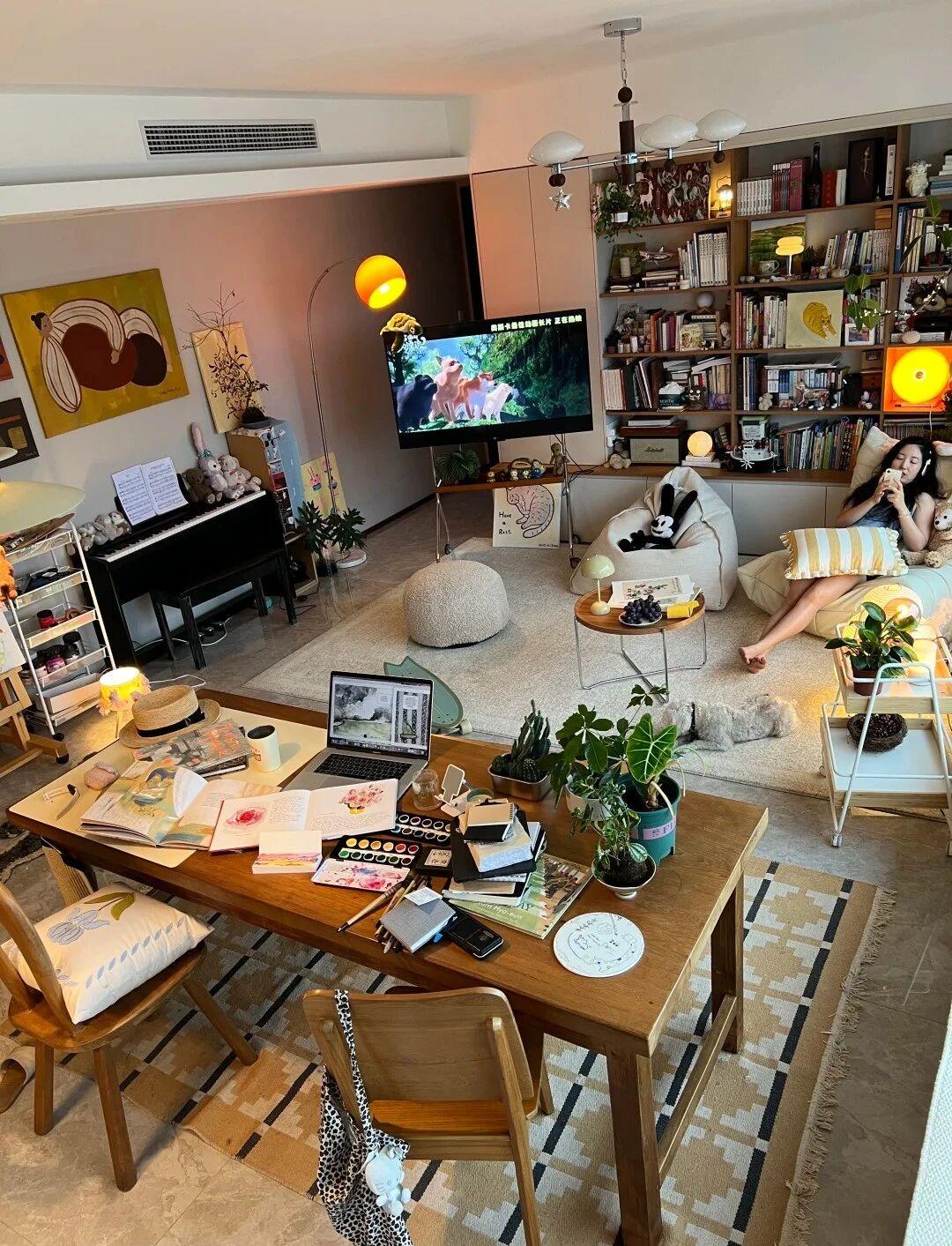 所以,博主直接发挥她天马行空的想法,将传统的电视、茶几等会客家具全部取消,一点点添置她喜好的家具、摆件,还将她的办公用品也一起搬到了客厅;