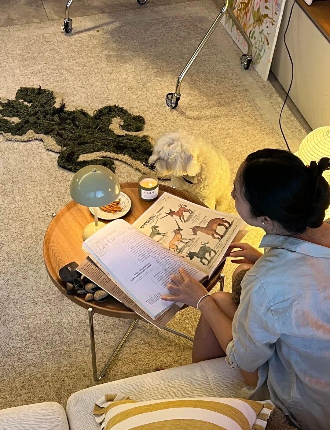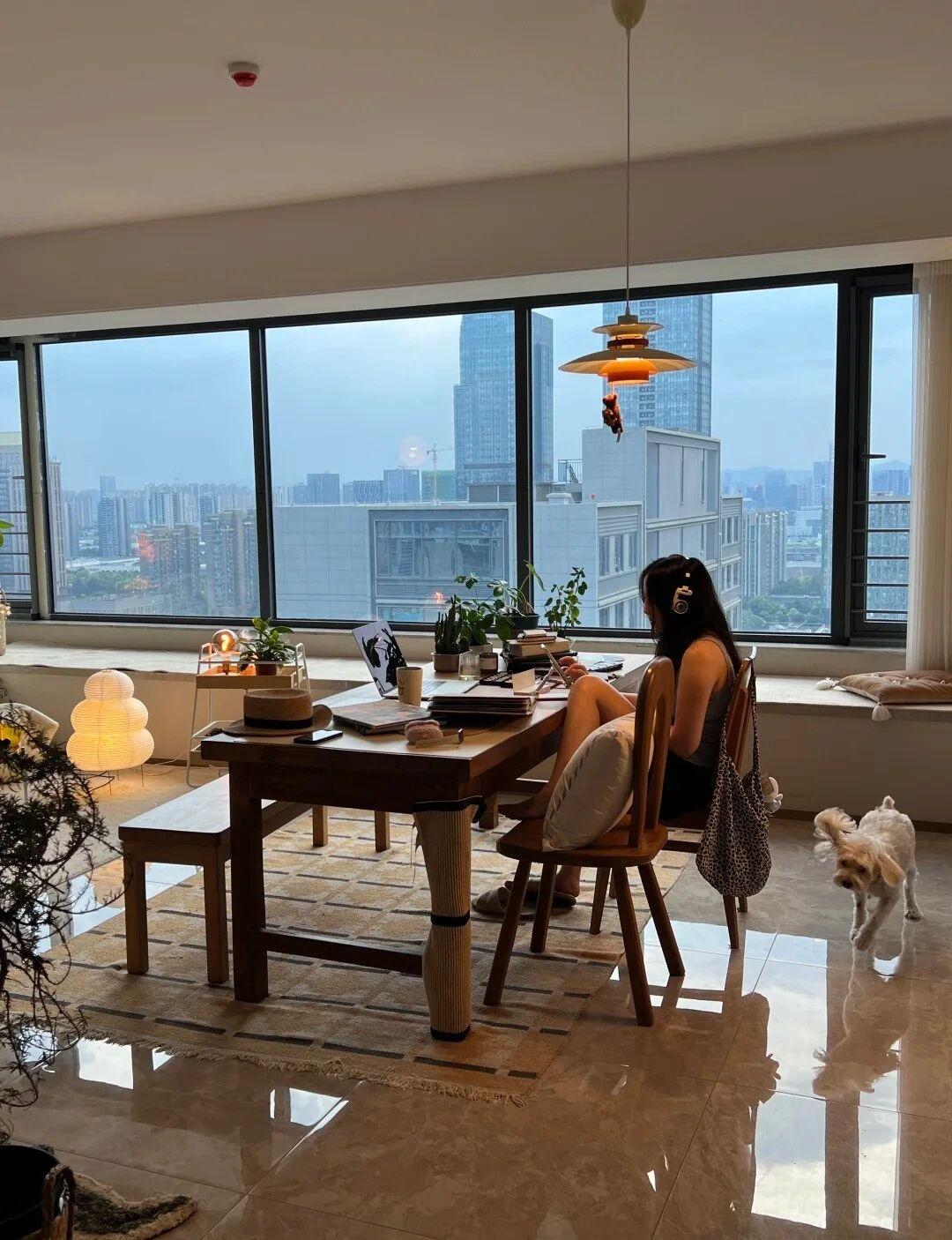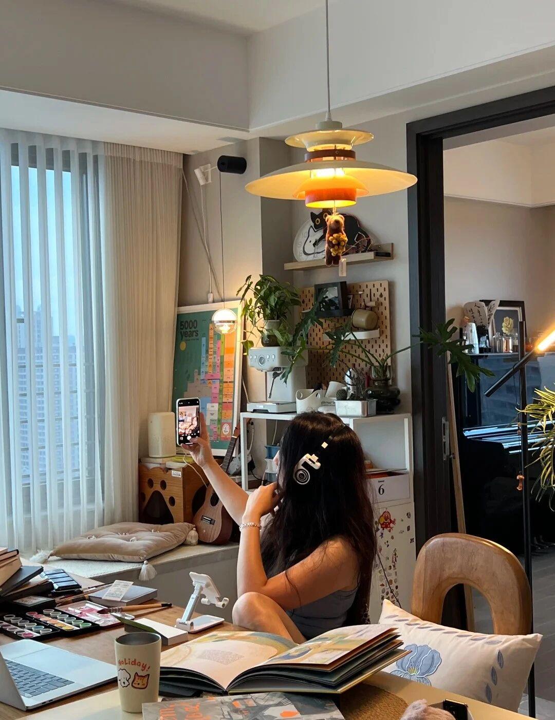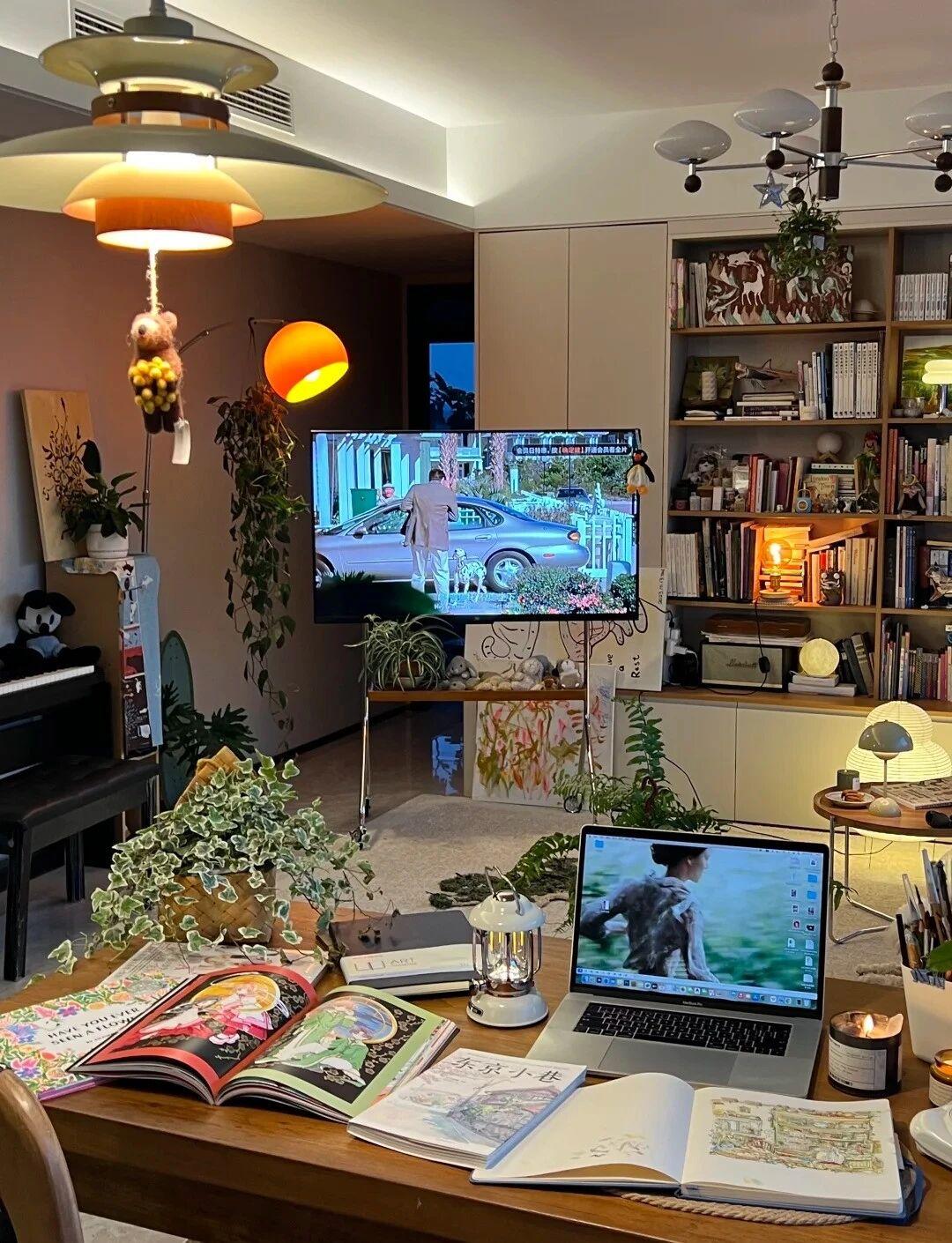 所以,博主直接发挥她天马行空的想法,将传统的电视、茶几等会客家具全部取消,一点点添置她喜好的家具、摆件,还将她的办公用品也一起搬到了客厅;