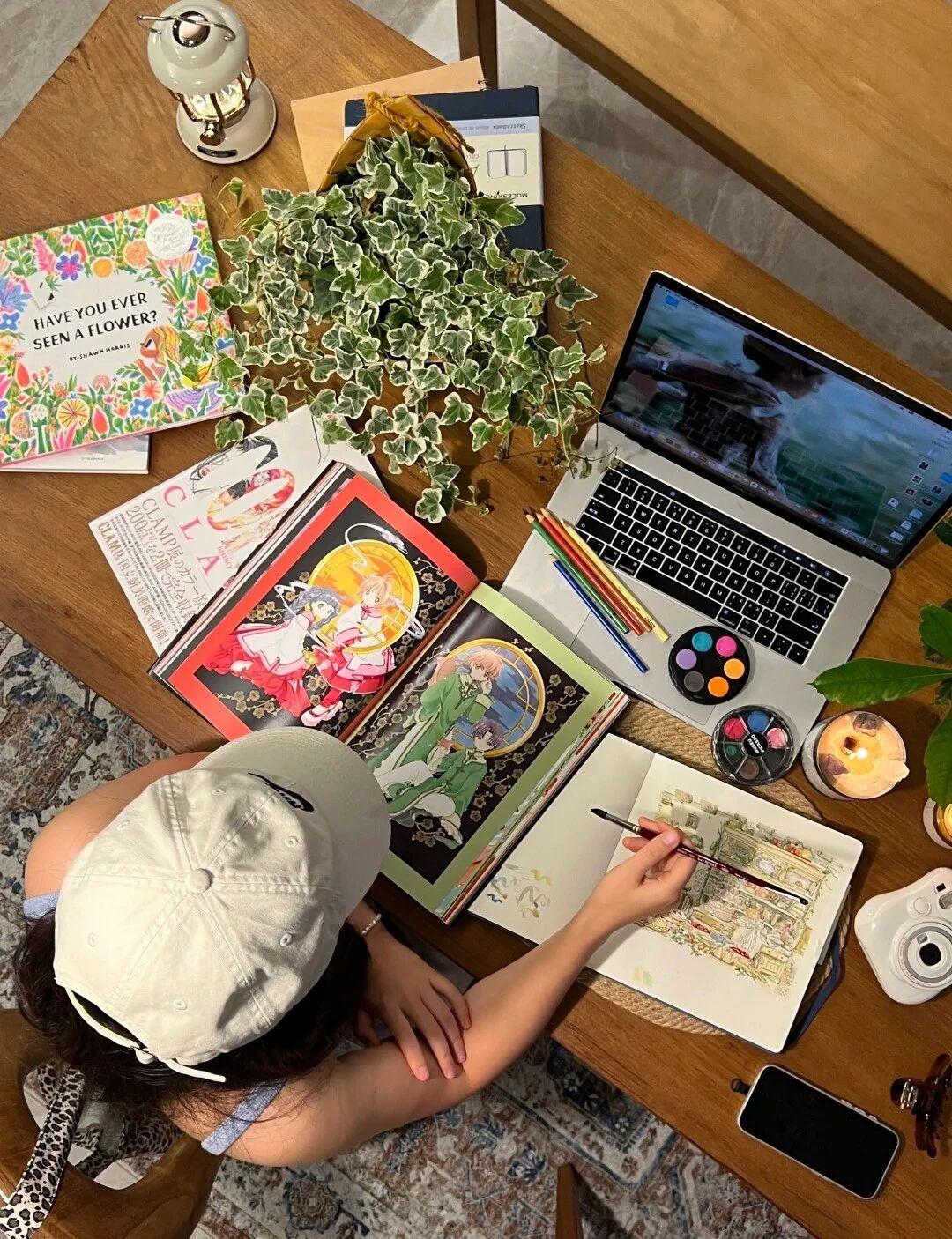 另一个就是办公区,也是靠近窗户的区域,摆放了一张超大的办公桌,笔记本、手机、咖啡杯、各种书籍、多肉、仙人掌、颜料、画板全都可以一次性摆放在上面,一点都不拥挤。