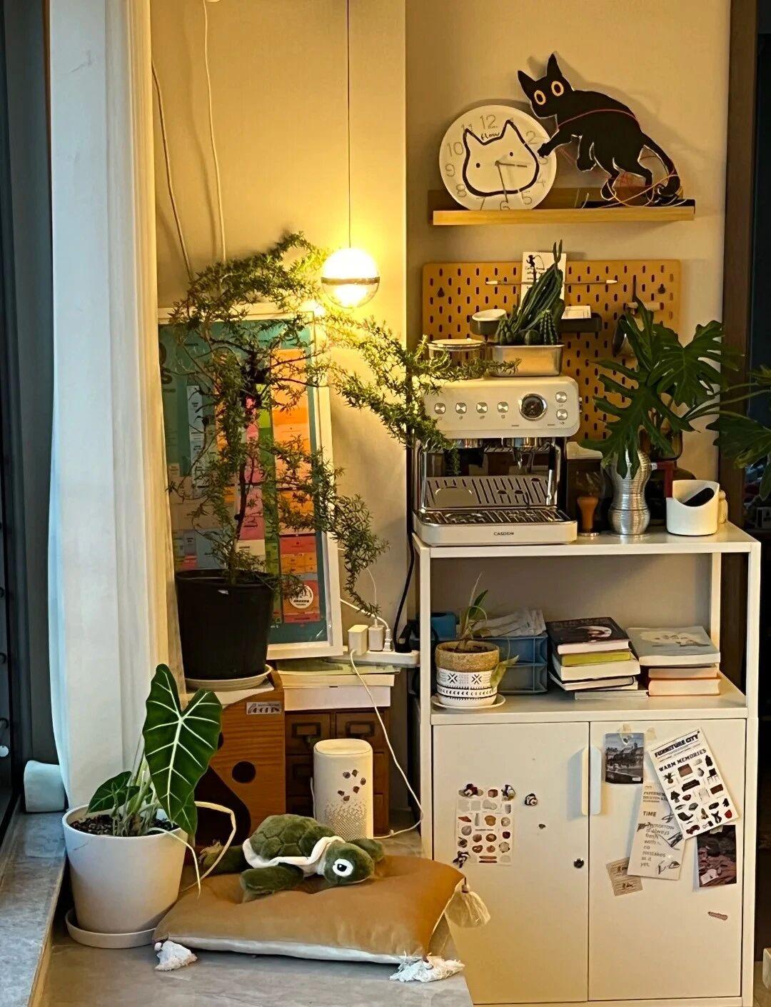 当然,这个空间还有一个小亮点,那就是绿植,它们真的随处可见,书架、小推车、办公桌、置物架,就连角落也摆上了绿植;