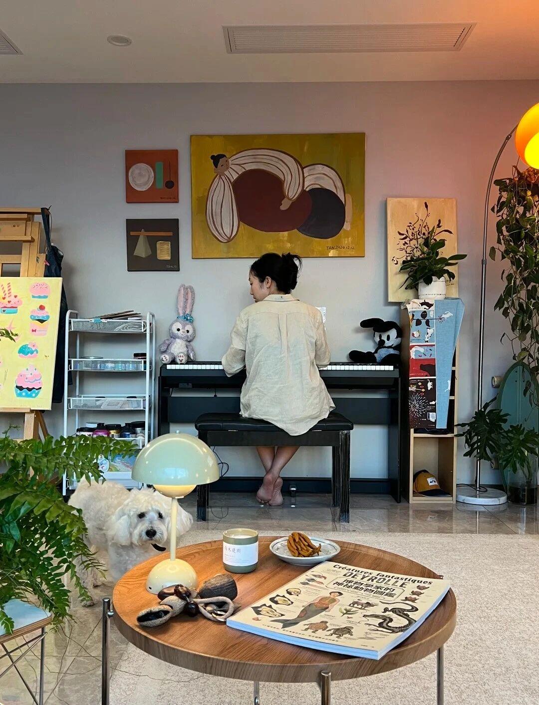而另一侧这铺了几何图案的地毯,靠近玄关的区域,则摆放了钢琴,左右两个都是置物架,放着乐谱、玩具、瓶瓶罐罐,搭配一盏艺术台灯,宅家办公的时候,觉得累了,就看看风景,练一练钢琴;