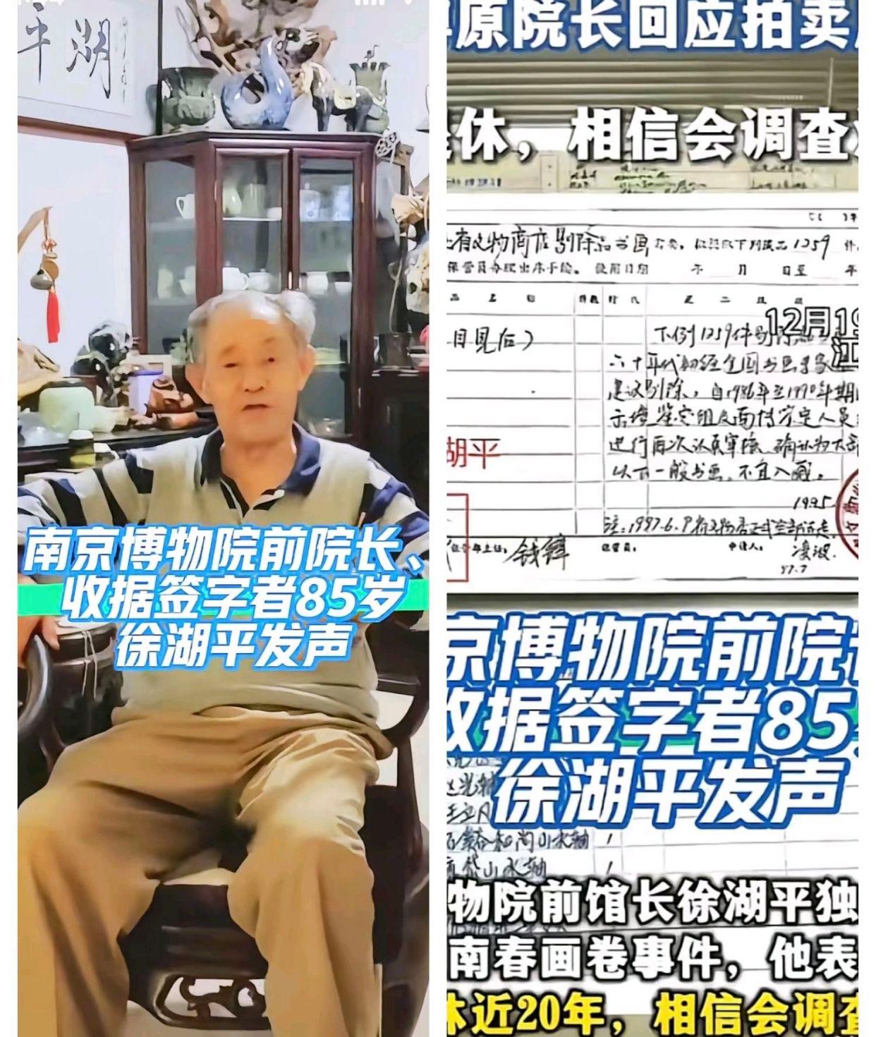 82岁的南京博物院前院长徐湖平,在12月19日晚面对《江南春》画作流拍事件的询问时,以抱恙之躯如此回应。然而,一份1997年5月8日的单据却显示——那幅被鉴定为“赝品”的《江南春》图卷拨交给江苏省文物总店的记录上,分明签着“徐湖平”的名字。