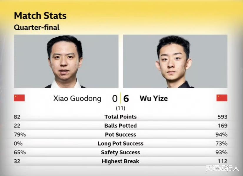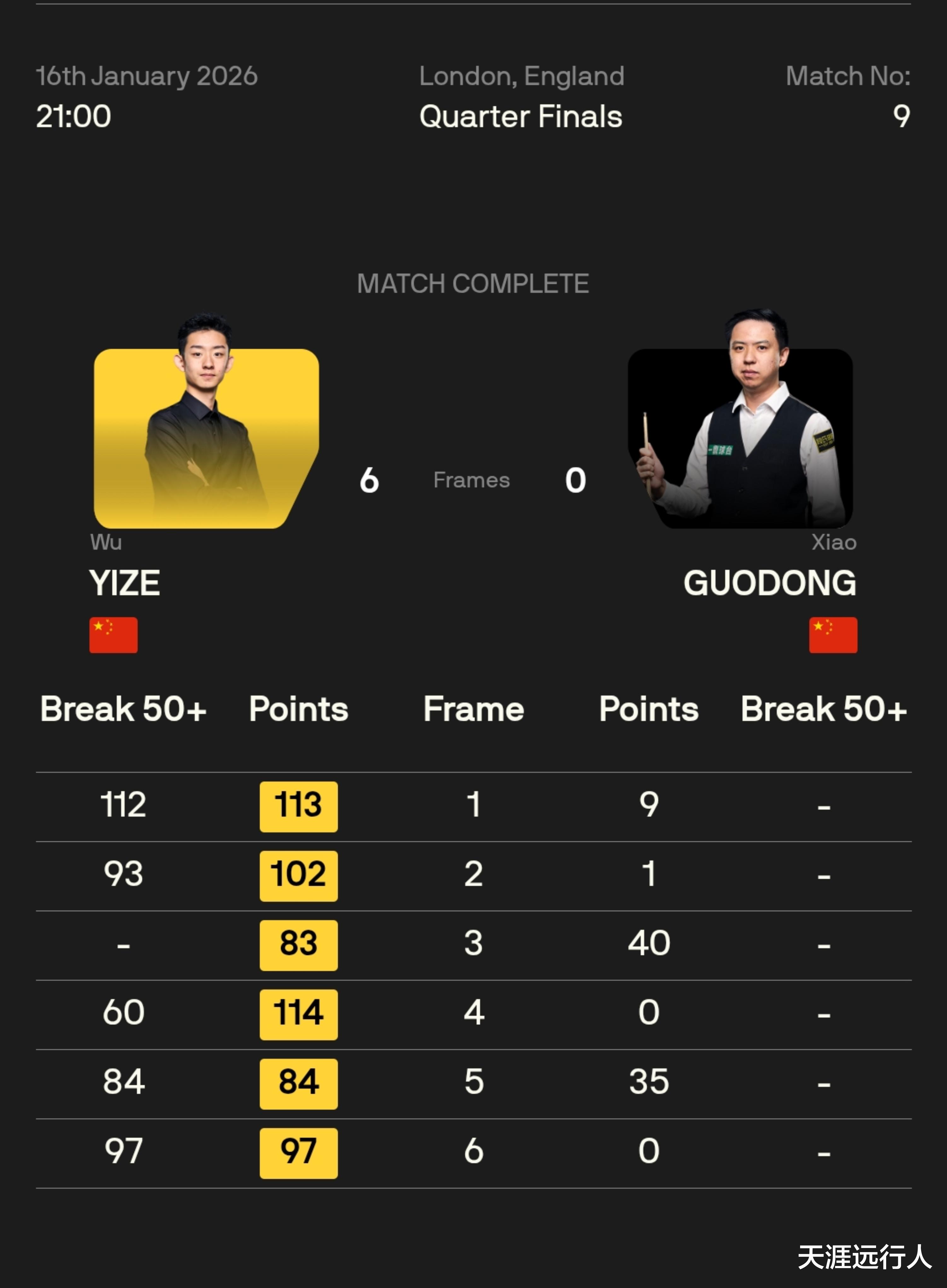 最终,吴宜泽以6-0横扫肖国栋,晋级四强,静待晚场凯伦·威尔逊与尼尔·罗伯逊之间的胜者。
