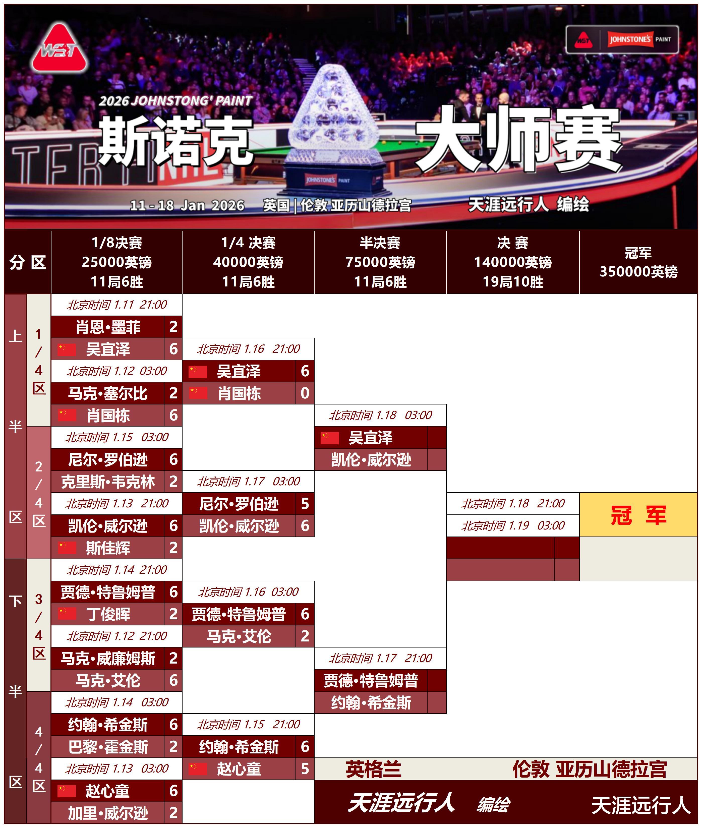 最新斯诺克大师赛完整进程签表,一表看大师赛全程,各位看官老师敬请转发收藏,以备不时之需