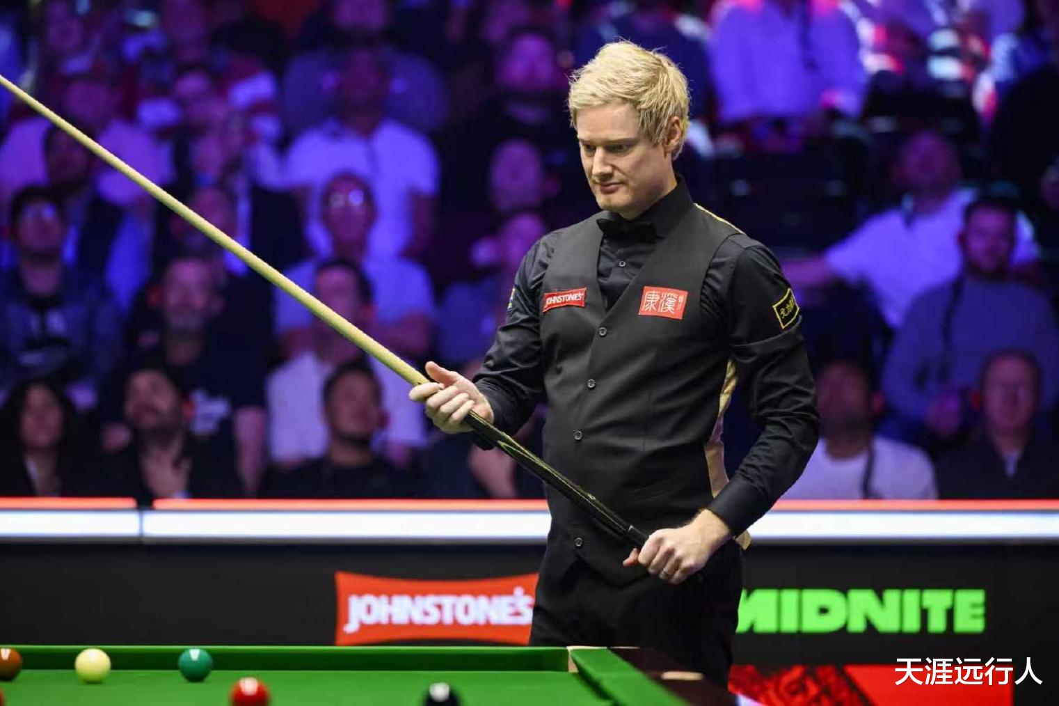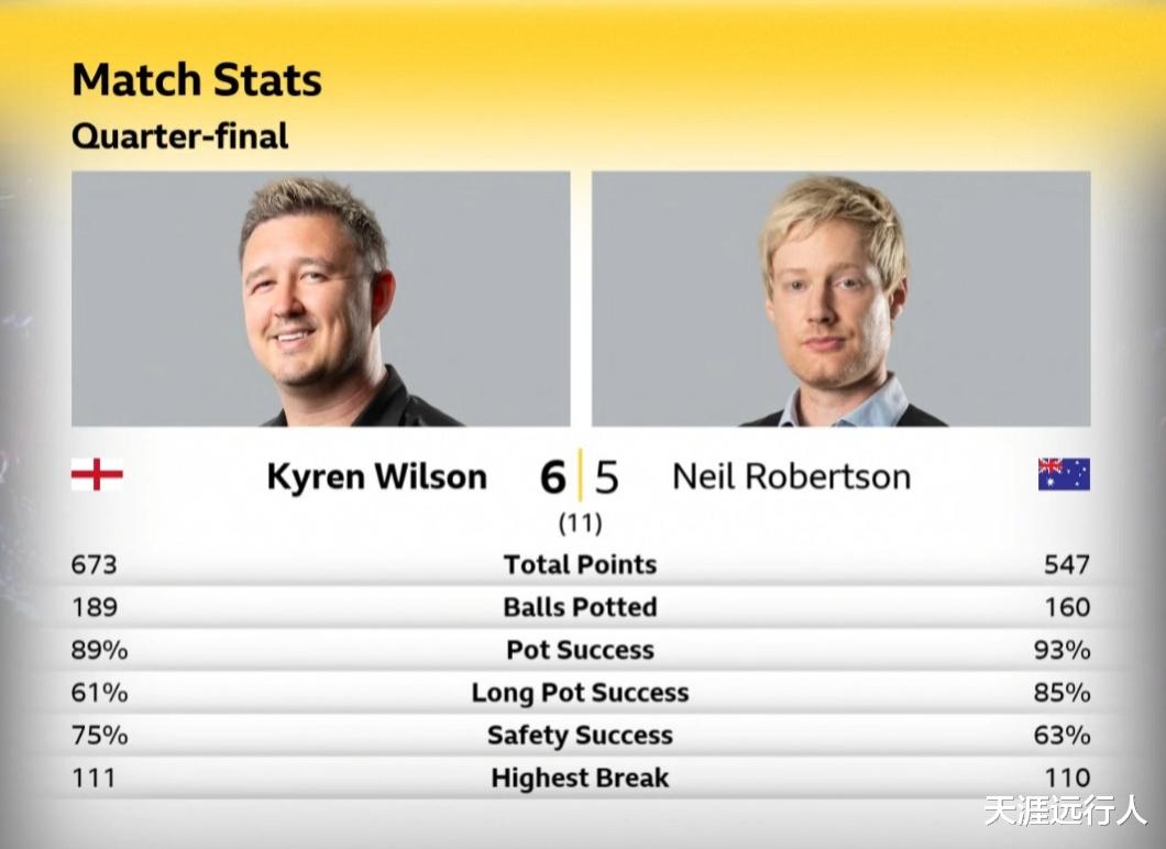 休息回来,凯伦·威尔逊单杆致胜,收割第五局,4-1领先尼尔·罗伯逊;罗伯逊缠斗中赢下第六局止血,接下来连打两杆破百,将比分扳至4-4,再打单杆63,凑成四连鞭,尼尔·罗伯逊5-4反超比分,先达赛点。