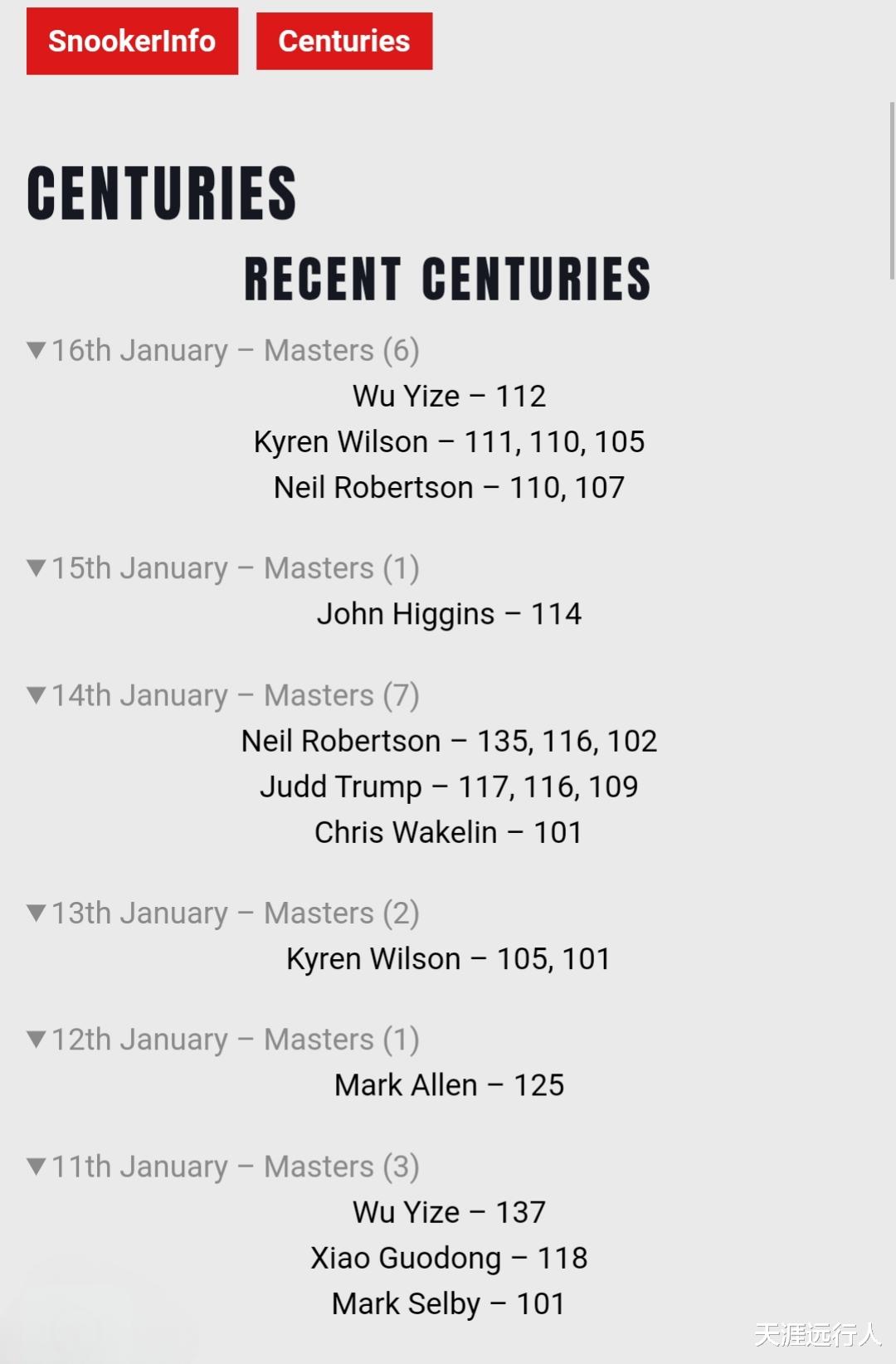 这个比赛日,共打出六杆破百,囧哥三杆、萝卜两杆,吴宜泽一杆,威尔逊和罗伯逊本届赛会都已完成五杆单杆过百,2026大师赛的破百杆数来到20杆,目前的单杆最高分还是吴宜泽首轮打出的单杆137分,有望拿到15000英镑的单杆最高分奖。