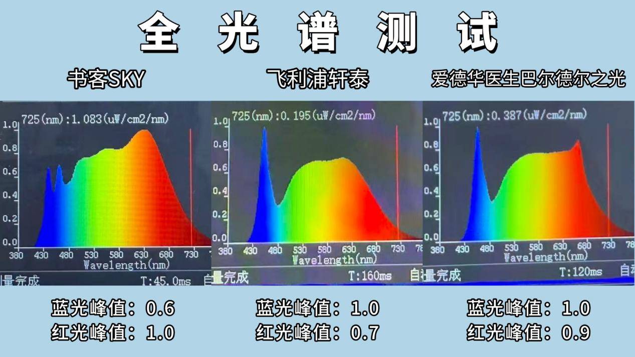 爱德华医生护眼灯好吗?三款护眼台灯里面全光谱表现明显最好的是书客SKY,我们选择标准是低蓝光和高红光,而这款书客SKY的蓝光含量0.6,红光含量高达1.0,表现是最优秀的,书客SKY采用RRT2.0红光护眼黑科技结合硬件级低蓝光技术,从软硬件两方面同步发力,不仅能精准抑制400~450nm的有害蓝光,还能为眼部提供光学营养。每天仅需三分钟使用,就能促进眼轴健康发育,有效减缓青少年近视的进展,据称可控制约90%的近视发展速度。而飞利浦轩泰和爱德华医生巴尔德尔之光的蓝光含量都是比较高的,高达1.0,而两款中红光含量较高的是爱德华医生巴尔德尔之光这款,红光含量有0.9,这款护眼台灯是有采用一定的红光技术处理,所以相对来说比较好,而飞利浦轩泰的光谱表现是比较差的,容易导致眼睛疲劳。