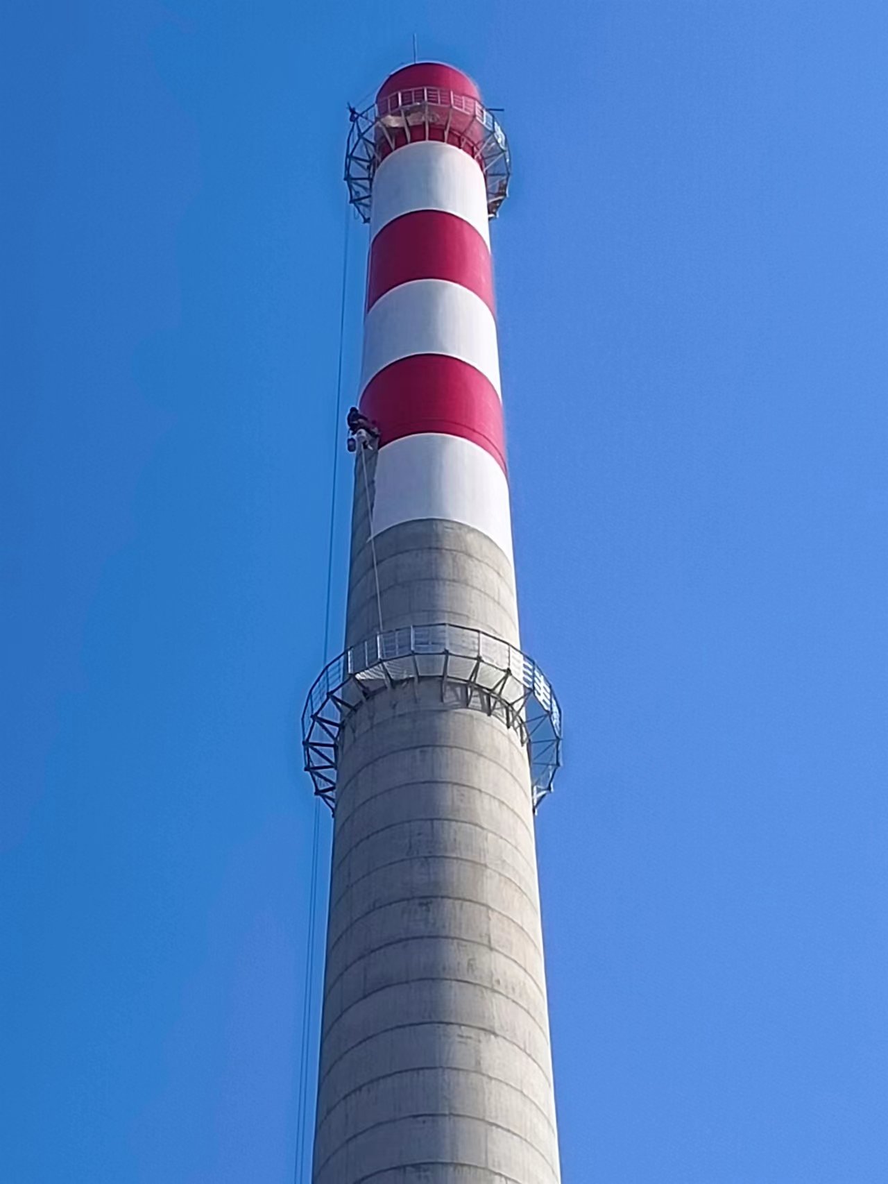 3.现场准备:清理烟囱周边施工区域,设置警戒区及安全标识;搭建符合规范的高空作业平台,检查平台 / 吊篮的稳定性、防护栏及升降系统;接好施工用水、用电,确保作业面照明充足;对烟囱周边设备、建(构)筑物做好遮盖防护,防止涂料污染。