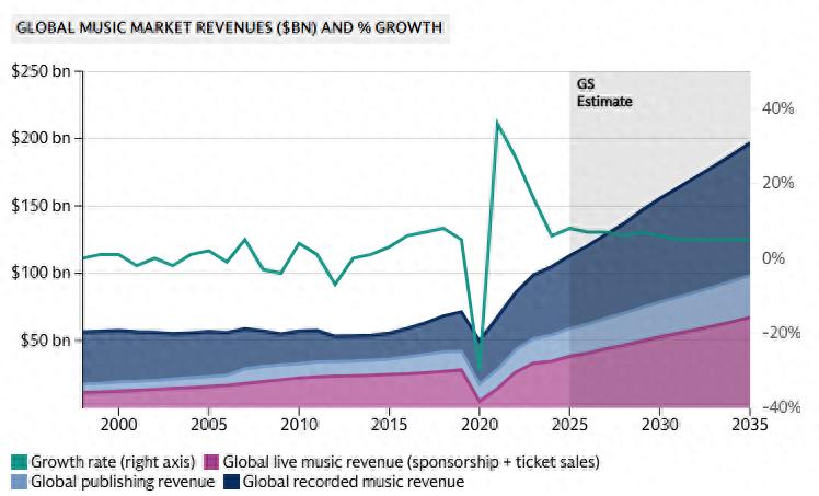 2024年,录制音乐和现场音乐领域的增长低于预期。但预计这两个领域——尤其是现场音乐——将在2025年加速发展。高盛研究部预测,2025年全球音乐收入将同比增长7.7%。