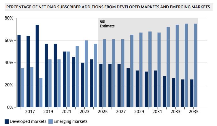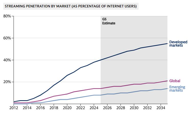 2010年代,发达市场推动了全球用户增长,根据我们分析师的预测,其渗透率从2014年的3%迅速上升至2024年的38%。然而,随着流媒体市场的成熟,这一增长在2023-24年开始放缓至高个位数。高盛研究部预测,未来五年,美国和英国等发达市场将实现中等个位数的增长。我们的分析师预计,到2035年,大多数发达市场的渗透率将达到峰值,约为75%。
