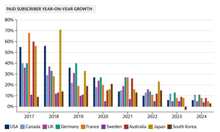 2024年,新兴市场的流媒体渗透率仅为8%,我们的分析师预计这一数字将在十年内升至14%,这意味着仍有数十亿的受众尚未开发。这些市场通常对价格更为敏感,因此音乐流媒体平台可能需要更加努力才能将听众转化为付费用户。但这一进程正在进行中。我们的分析师表示,去年新兴市场贡献了60%的新增用户。