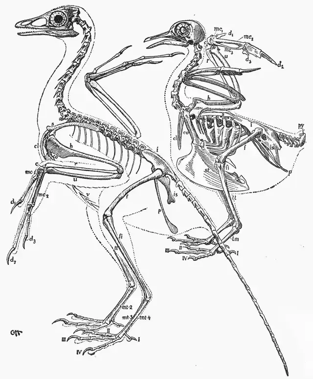 始祖鸟(左)和今鸟(右)骨骼对比,py即为尾综骨