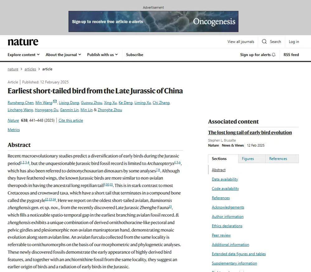 ^Chen, R., Wang, M., Dong, L. et al. Earliest short-tailed bird from the Late Jurassic of China. Nature 638, 441–448 (2025). https://doi.org/10.1038/s41586-024-08410-z