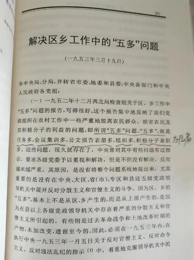 1953年3月,毛主席起草了《关于解决区乡工作中“五多”问题的指示》。认为西北局调查组的报告,集中反映了党政组织在农村工作中任务多、会议集训多、公文报告表册多、组织多、积极分子兼职多的“五多”问题。