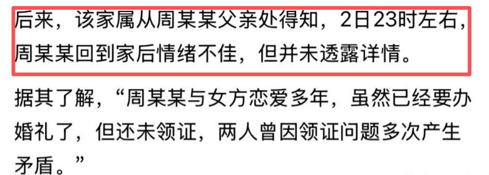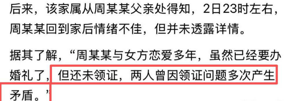 另外,据周某的亲戚透露,两人实际上并未领取结婚证,而且此前就曾因领证问题多次产生矛盾。这些因素是否与周某某所说的“委屈”有关,目前尚不得而知。
