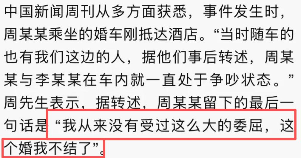 据当时坐在婚车内的相关人员透露,从接亲到抵达酒店的路上,两人一路争吵,当婚车抵达酒店门口时,周某某整个人显得异常愤怒。
