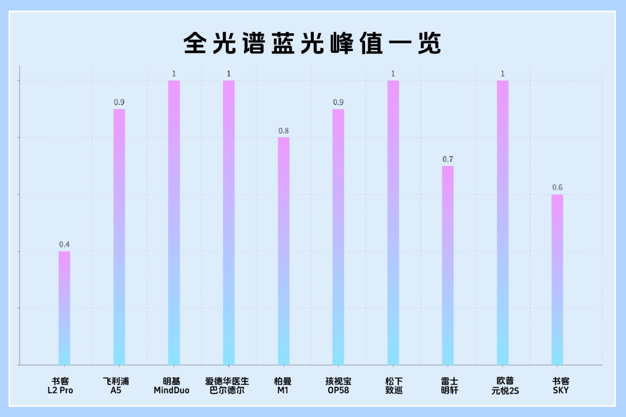 第三梯队(蓝光高且红光低):飞利浦A5、明基MindDuo、孩视宝OP58、松下致巡、欧普元悦2S