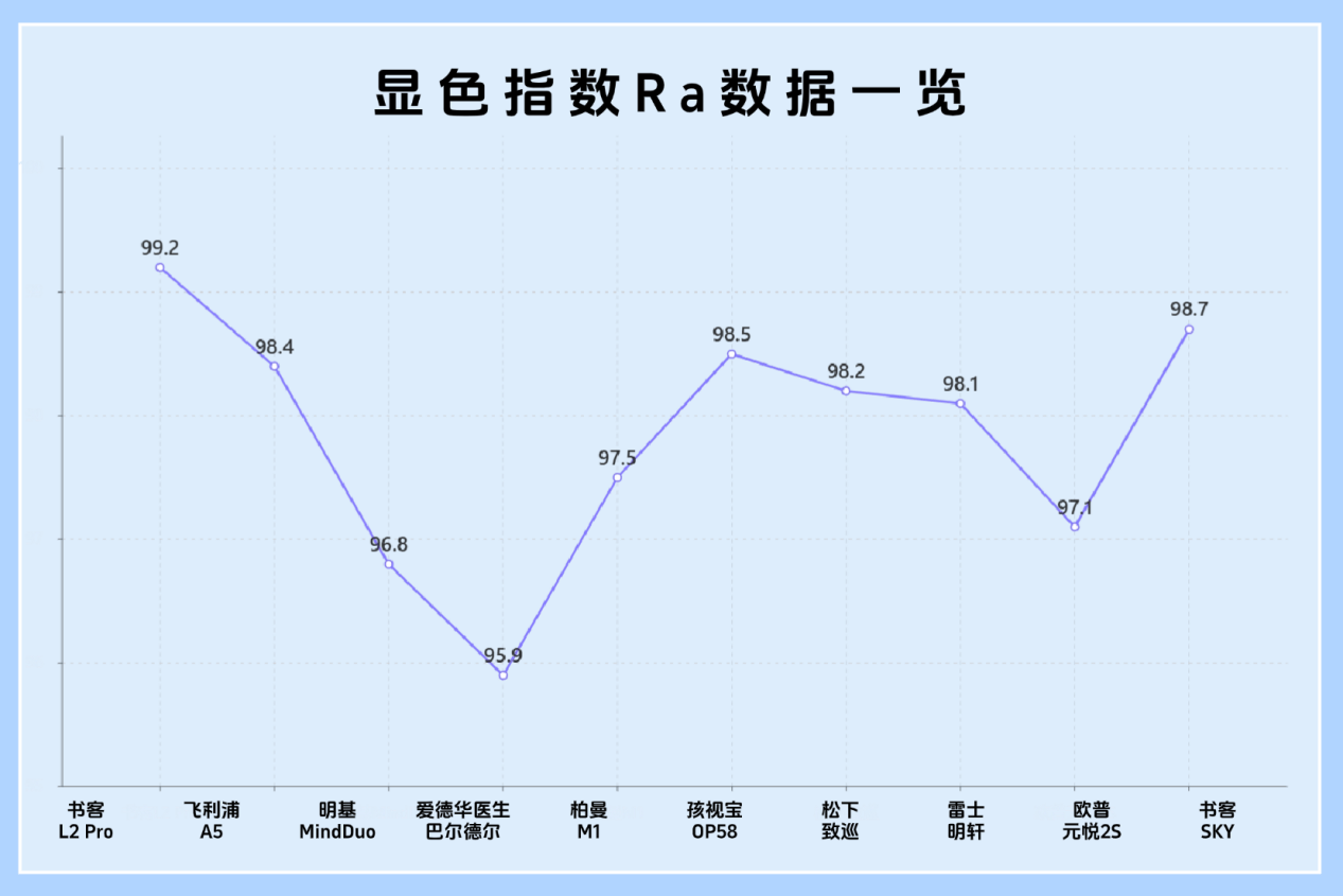 第二梯队(Ra在98+):飞利浦A5、孩视宝OP58、松下致巡、雷士明轩、书客SKY