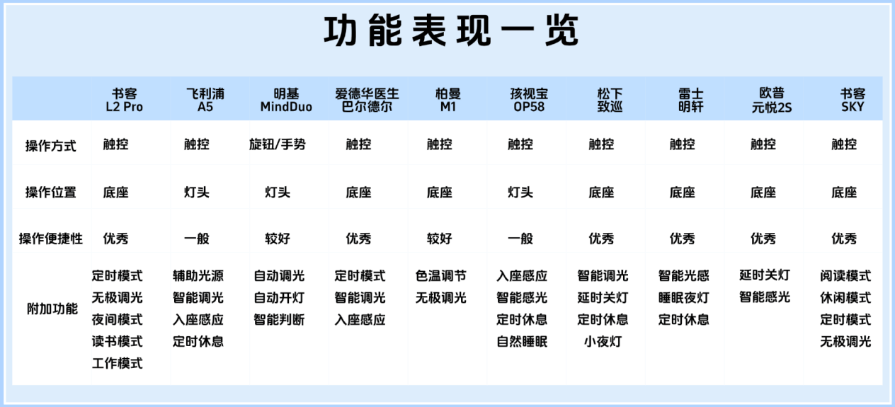 从功能设计来看,这些台灯都能满足日常使用需求。下面我有用一张图表对各款台灯的功能进行了汇总,建议大家根据自身需求进行选择。