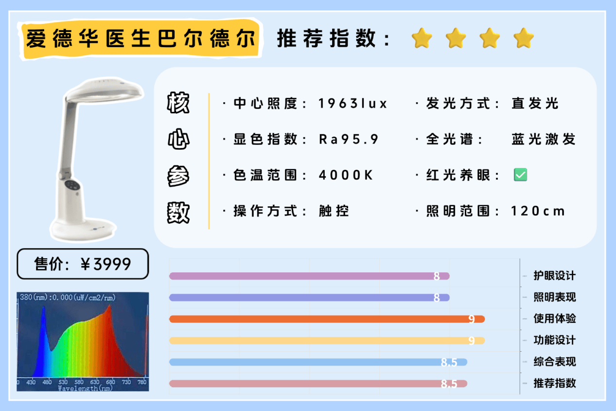 l 在核心的护眼养眼方面,爱德华医生巴尔德尔采用的是蓝光激发全光谱技术,有害蓝光峰值偏高达到了1.0,长时间使用可能会对眼睛造成伤害,但它又采用了NIR红光养眼技术,可以增加有益红光波段,实现缓解眼睛疲劳的效果,整体来说护眼效果中规中矩。