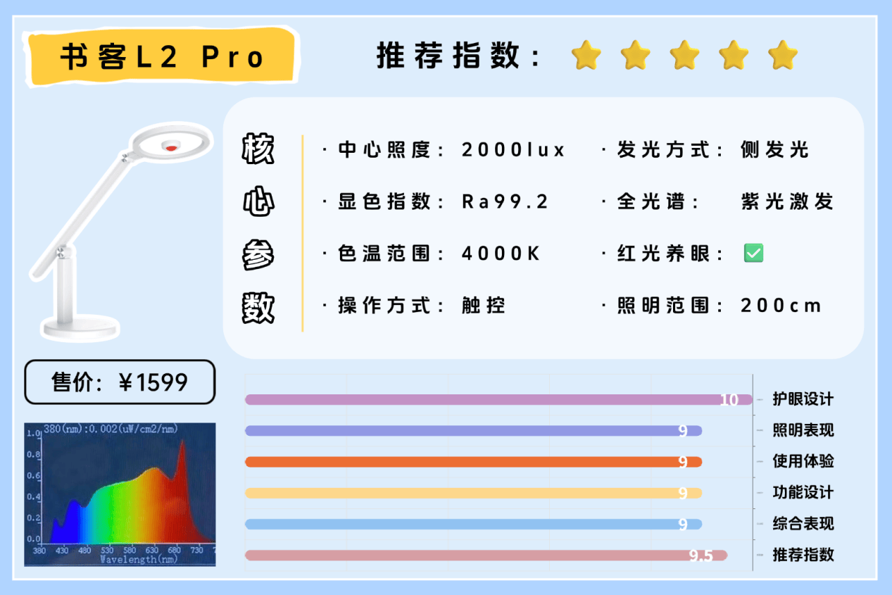 l 在核心的护眼养眼方面,书客创新地研发了RRT2.0红光养眼技术和紫光激发全光谱技术,精准过滤400-455nm有害蓝光,将蓝光峰值降低至0.4同时增强有益红光,可延缓用眼疲劳,降低96%近视风险。