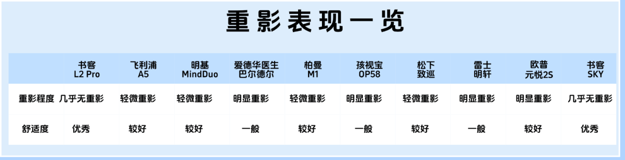 第一梯队(几乎无重影):书客L2 Pro、书客SKY