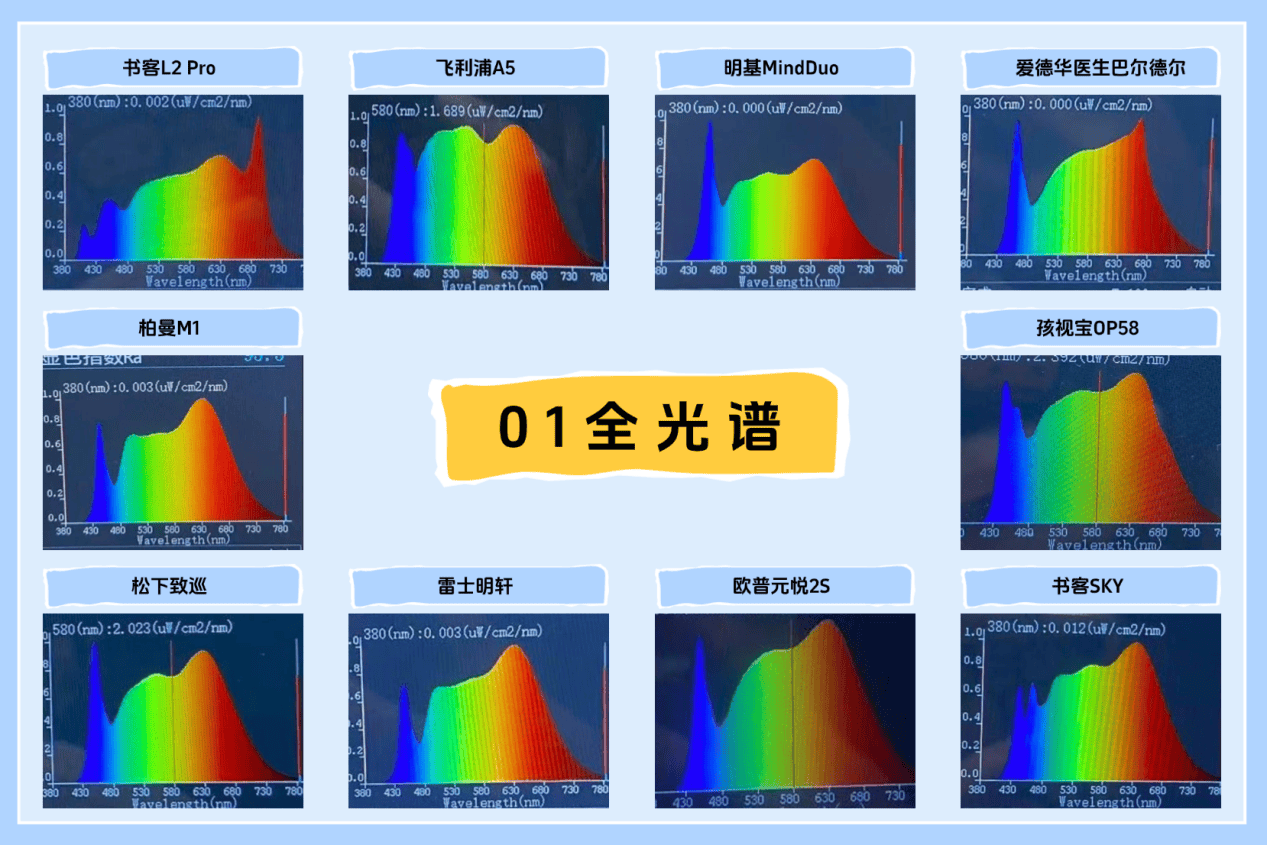 采用光谱仪逐一测量10款灯在400–455nm区间的蓝光峰值,同时看是否有红光增益。