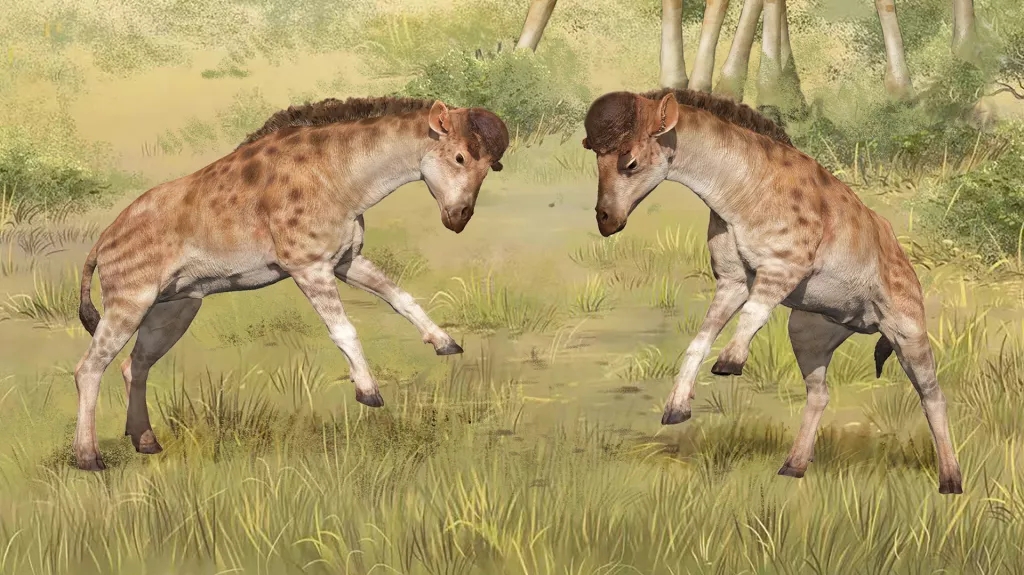 大约 1700 万年前,在中国北方漫游的现代长颈鹿的一个亲戚有着粗壮的脖子和厚实的头骨——非常适合在头撞战中与竞争对手的雄性争吵。