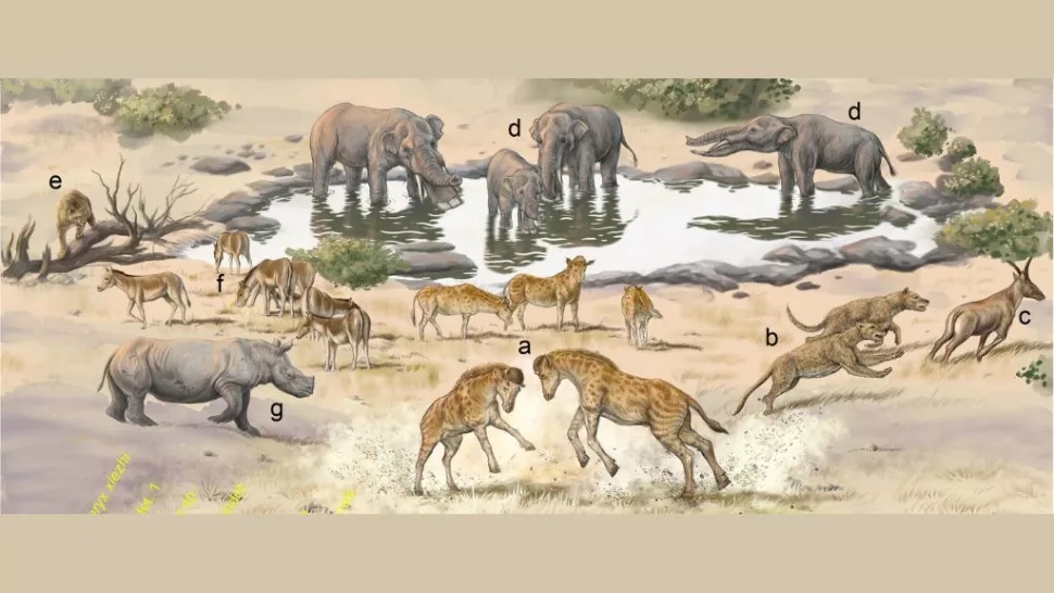 图注:新命名的长颈鹿近亲Discokeryx xiezhi (a) 生活在大约 1690 万年前。这幅风景 (bg) 中描绘的其他动物也被认为在当时也生活在中国准噶尔盆地。(图片来源:Wang et al., Science (2022))