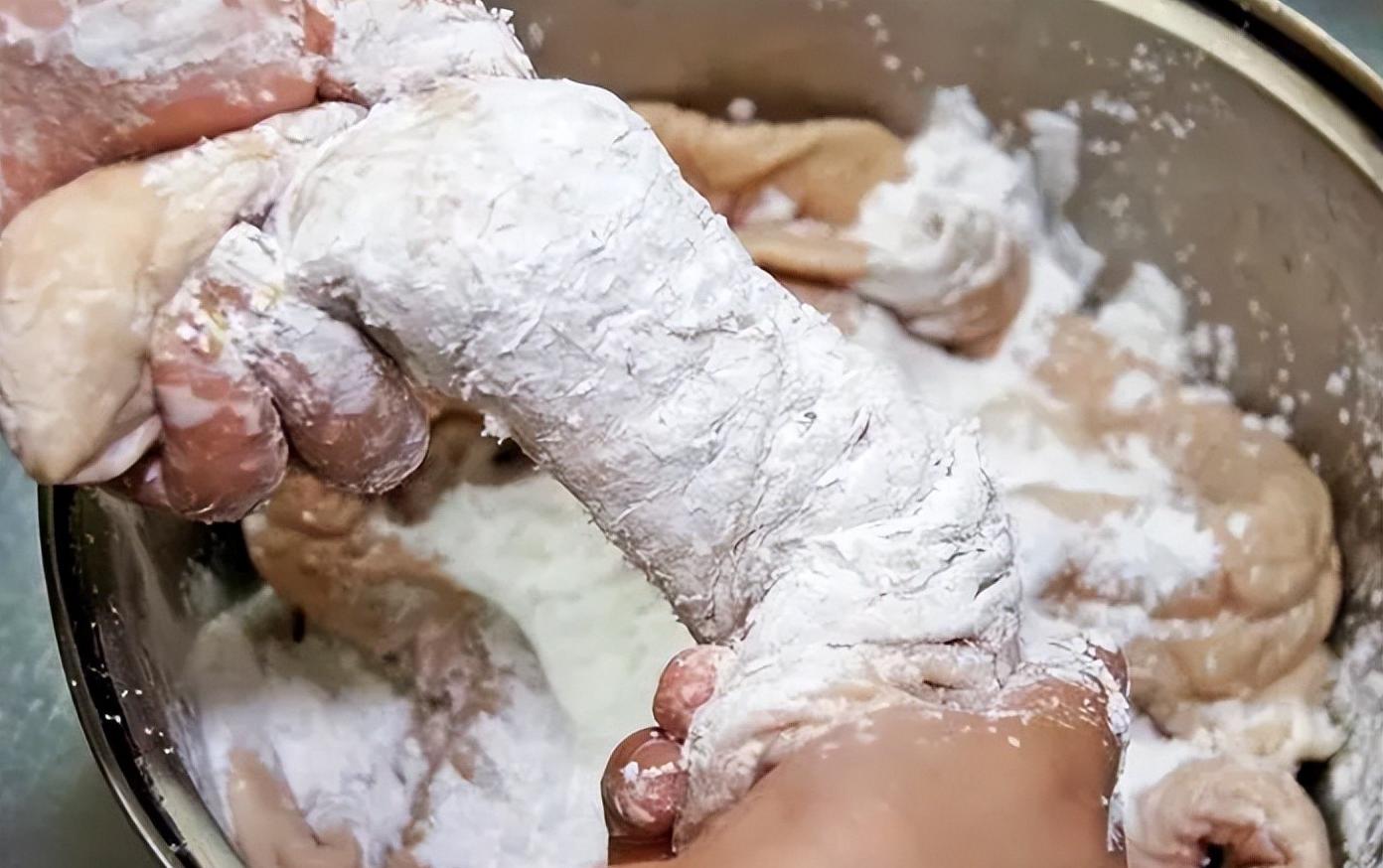 加入一大勺面粉,用双手搓洗猪大肠表面。