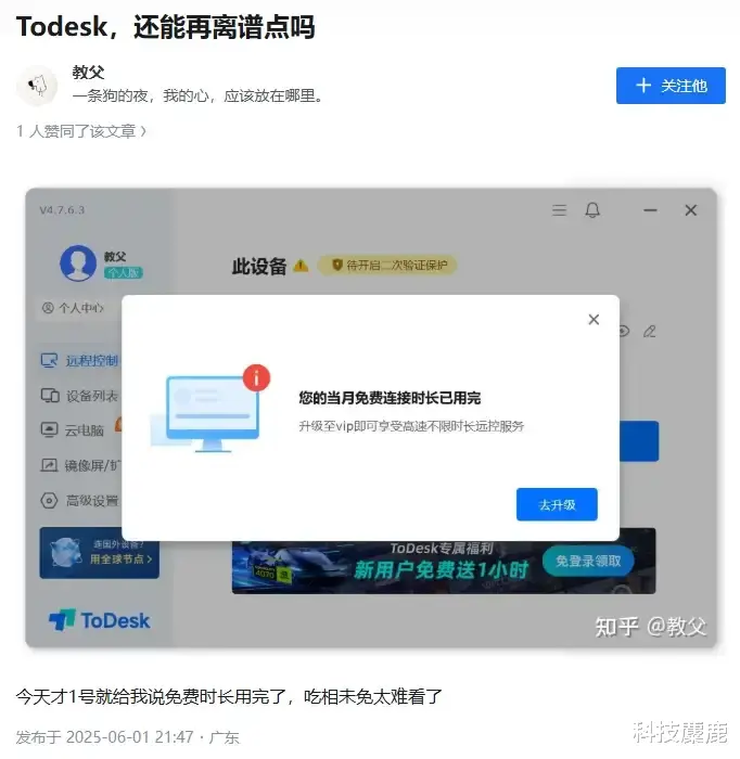 ToDesk则采用了非常激进的策略,实际上已经几乎不提供免费使用:官方限制每月使用时长和连接次数,同时没有明确具体的时长,很多用户发现刚刚月初就无法使用,逼迫用户购买会员。