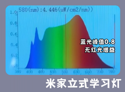 米家立式学习灯的蓝光峰值为0.8,并且没有配备红光增益功能,无法辅助缓解眼底疲劳,光谱曲线也存在局部轻微断层,孩子长时间用眼时,眼睛需频繁调节适应波段差异,容易出现酸胀感,护眼效果有限。