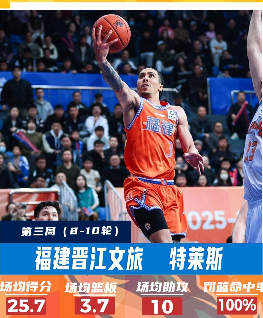 福建男篮外援特莱斯,当选第三周周最佳球员,他本周出战3场比赛,率队取得2胜1负的战绩,他场均出场30分钟,可以得到25.7分3.7篮板10助攻1.7抢断的数据,罚篮命中率100%(23罚全中)。在主场与新疆伊力特的比赛中,砍下41分并送出12次助攻,成为本赛季首位单场得到40+得分和10+助攻的球员。