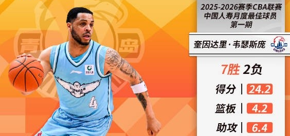 青岛男篮外援威瑟斯庞,12月共出战9场比赛,场均出战23分钟,砍下24.2分4.2篮板6.4助攻1.6抢断的全面数据。投篮命中率53.3%。 青岛崂山啤酒队目前以7胜2负的战绩暂列联赛积分榜第四位,本赛季杨瀚森加盟了NBA,谁也没能想到,在刘维伟指导的带领以及外援的出色发挥下,他们还能打进四强。