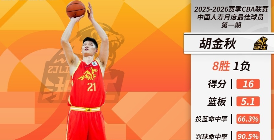 浙江广厦男篮胡金秋,12月一共出战9场比赛,帮助球队取得其中8场胜利,场均出场时间25分钟,可以得到16分、5.1篮板,投篮命中率高达66.3%、罚篮命中率90.5%,浙江广厦男篮目前以8胜1负的战绩,排名联赛积分榜榜首。作为CBA的大基本功先生,胡金秋的特点就是稳,而他也是本赛季常规赛MVP的最有利争夺者。