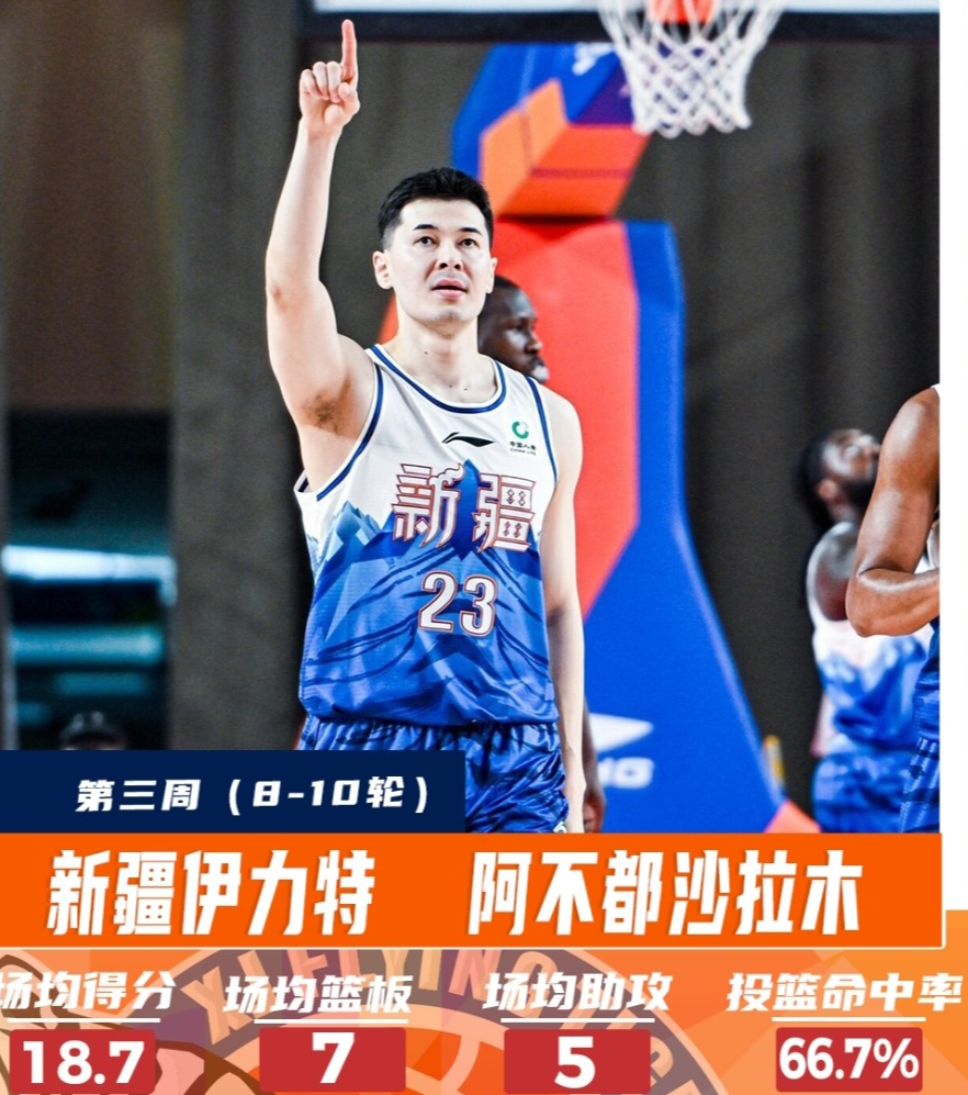 新疆男篮队长阿不都沙拉木,当选第三周周最佳球员,本周沙拉木一共出战3场比赛,带队拿到2场胜利,这对于新疆男篮来说可真是不容易。沙拉木场均出场29分钟,可以得到18.7分、7篮板、5助攻的全面数据,投篮命中率66.7%。赛季初刘炜指导没有给沙拉木太多机会,临下课之前的几场比赛,才渐渐增加了他的上场时间。
