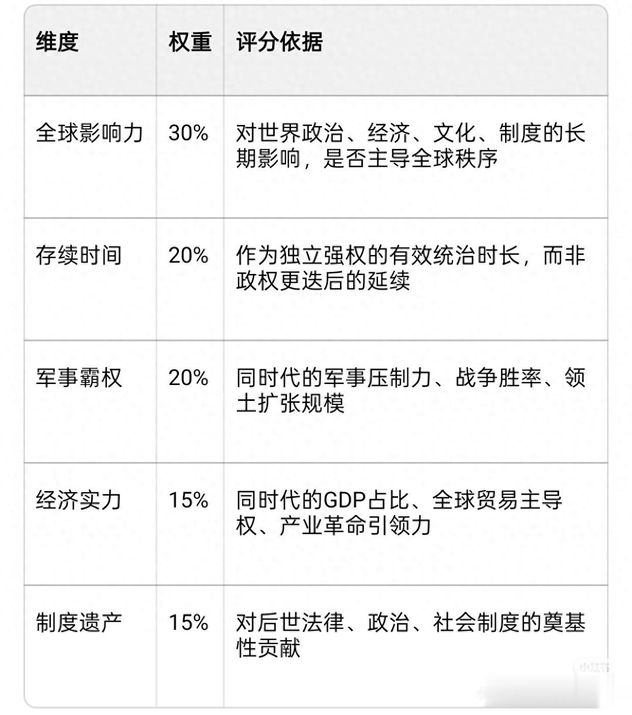 为了彻底解决原榜单的标准混乱问题,本次排名采用5大核心维度+权重占比,所有评分基于历史学界公认的史实,可追溯、可验证:
