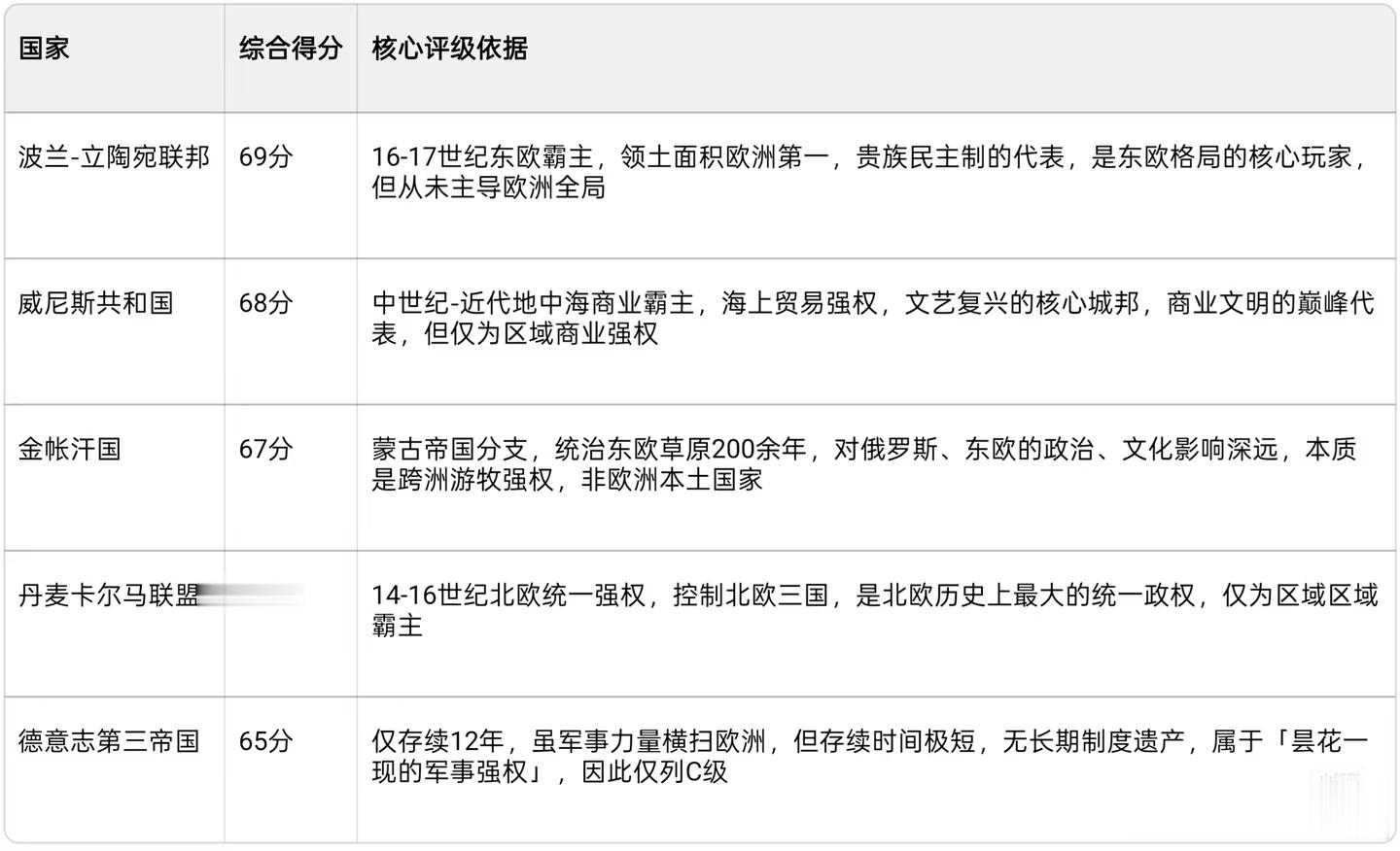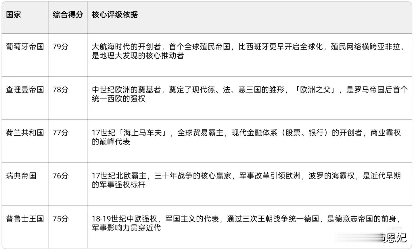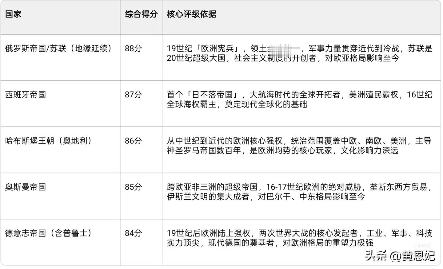 C级:区域强国(综合得分60-69分,局部影响力,未主导欧洲)#世界史[话题]# #近代史[话题]# #历史学[话题]# #世界大学排名[话题]# #英国[话题]# #罗马[话题]# #法国[话题]# #俄罗斯[话题]# #西班牙[话题]# #奥地利[话题]#