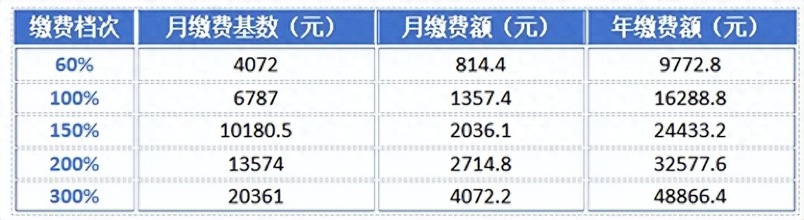 2025年养老保险缴费基准值为6787元/月,缴费档次可在60%-300%之间自主选择(月缴费基数4072元至20361元)。具体档次及金额如下: