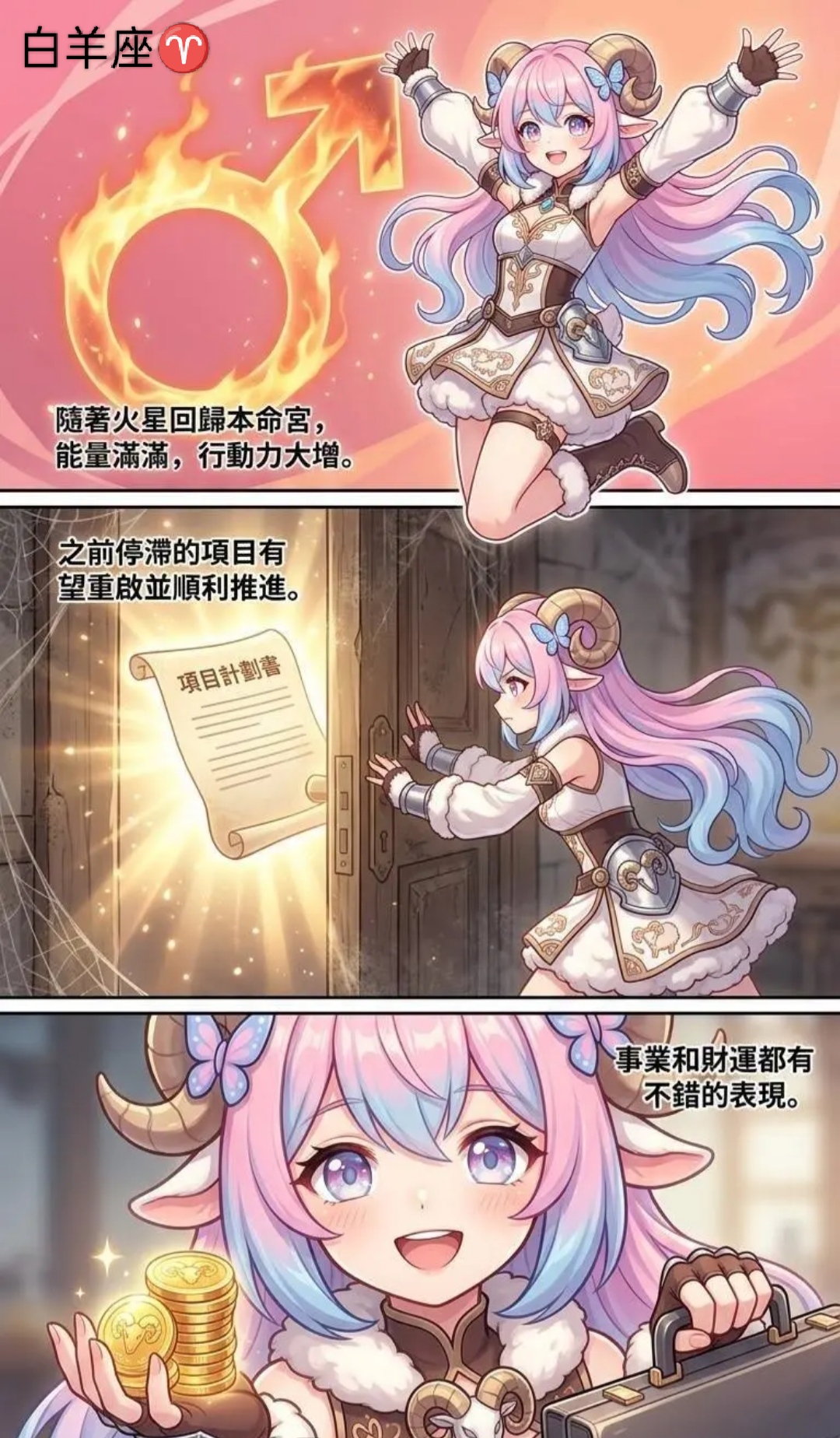 白羊座:随着火星回归本命宫,能量满满,行动力大增。之前停滞的项目有望重启并顺利推进,事业和财运都有不错的表现。