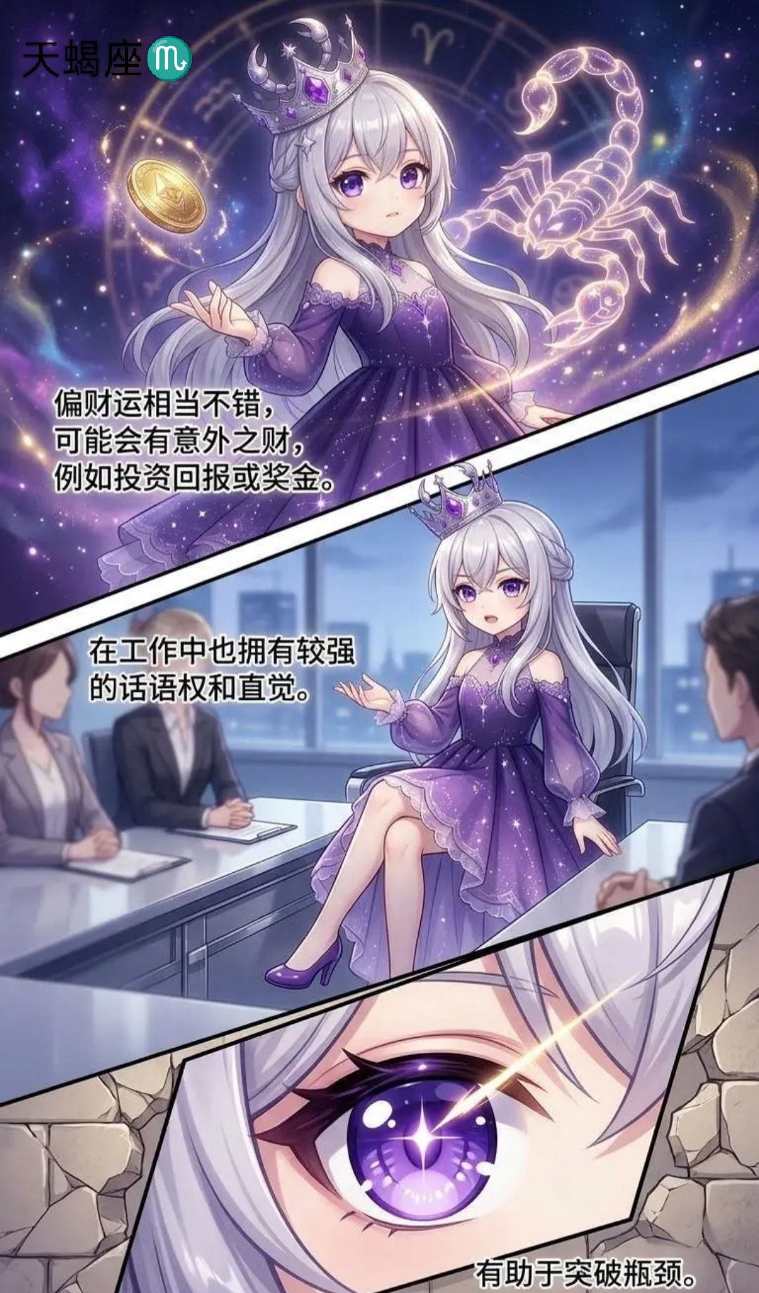 天蝎座:偏财运相当不错,可能会有意外之财,例如投资回报或奖金。在工作中也拥有较强的话语权和直觉,有助于突破瓶颈。