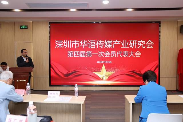 2025 年 11 月 26 日下午,深圳市华语传媒产业研究会第四届第一次会员代表大会于南山区三航科技大厦 6 楼公字厅盛大启幕。本次会议由胥苗龙主持,众多行业领导与会员代表齐聚一堂,共襄盛会,见证这一具有里程碑意义的重要时刻。