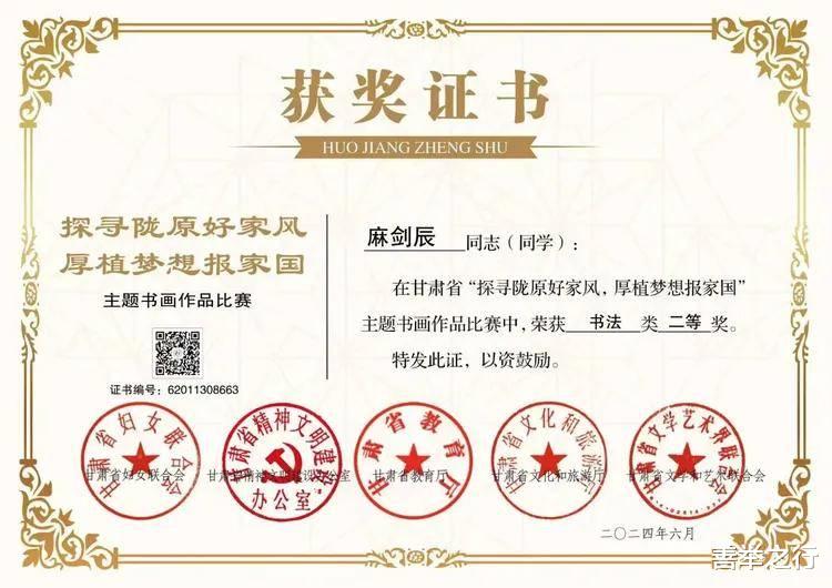 麻剑辰同学在甘肃省“探寻陇原好家风,厚植梦想报家国”书法大赛中荣获硬笔书法二等奖。