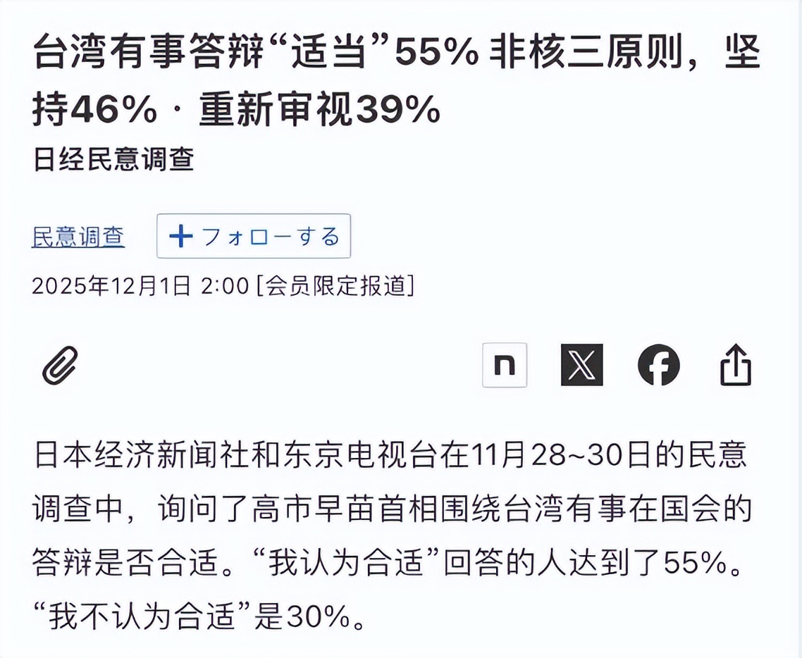 因为民调询问日本人:高市早苗首相绕“台海有事就是日本有事”在国会的答辩是否合适?结果超过一半的日本人,也就是55%认为合适。认为不合适的只有30%。