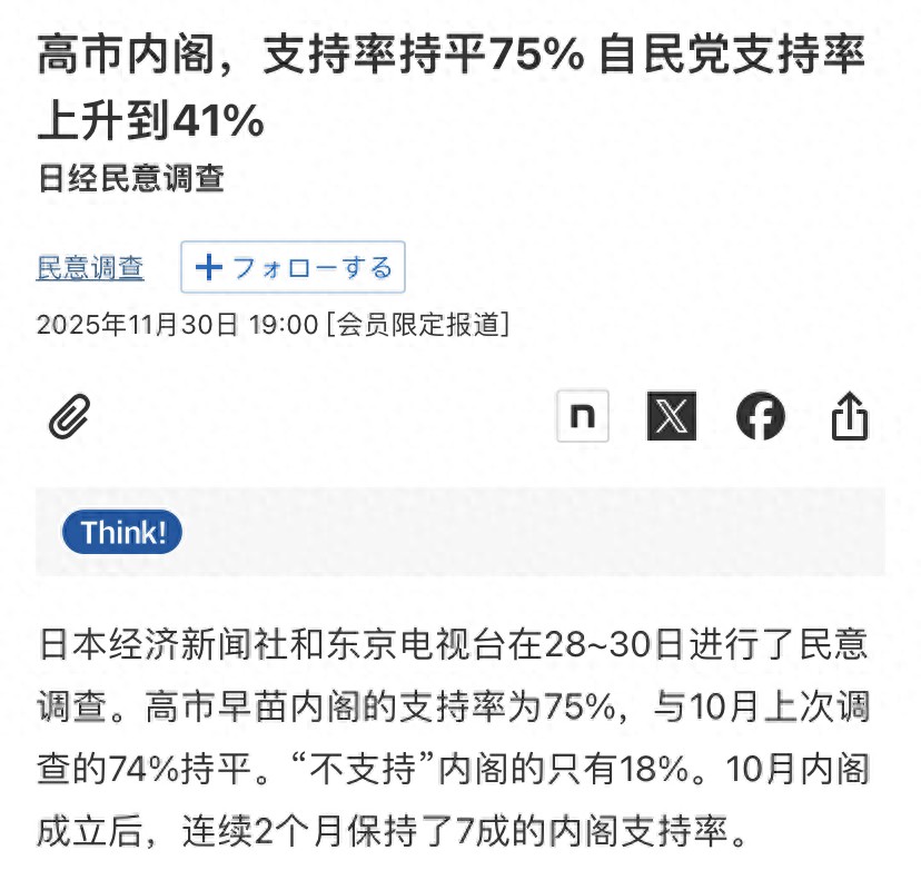 这说明中日争端以来,依然有四分之三的日本民众对高市早苗内阁的政策表示认可。