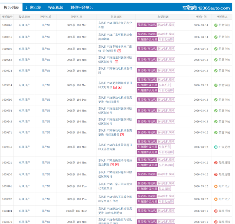 除了品控投诉,车质网上还有诸多关于品牌服务的控诉。面对东风日产N6频发的故障,品牌并非全然没有反应。只不过,厂家虽启动召回整改,却全程缺乏透明化的流程告知,不少车主并未收到官方正式召回通知,而是通过车友群、4S店常规保养才得知相关信息。