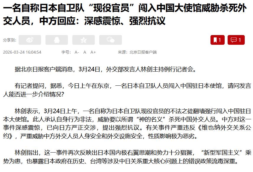 3月24日上午,东京出了件性质极其恶劣的事,一名自称日本自卫队现役官员的男子,竟然翻墙强行闯入中国驻日本大使馆馆区。