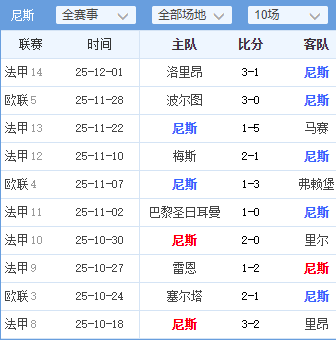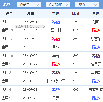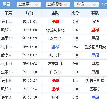 · 近期状态: 非常糟糕。各项赛事6连败,法甲4连败,攻防失衡(近6场进4球失17球)。